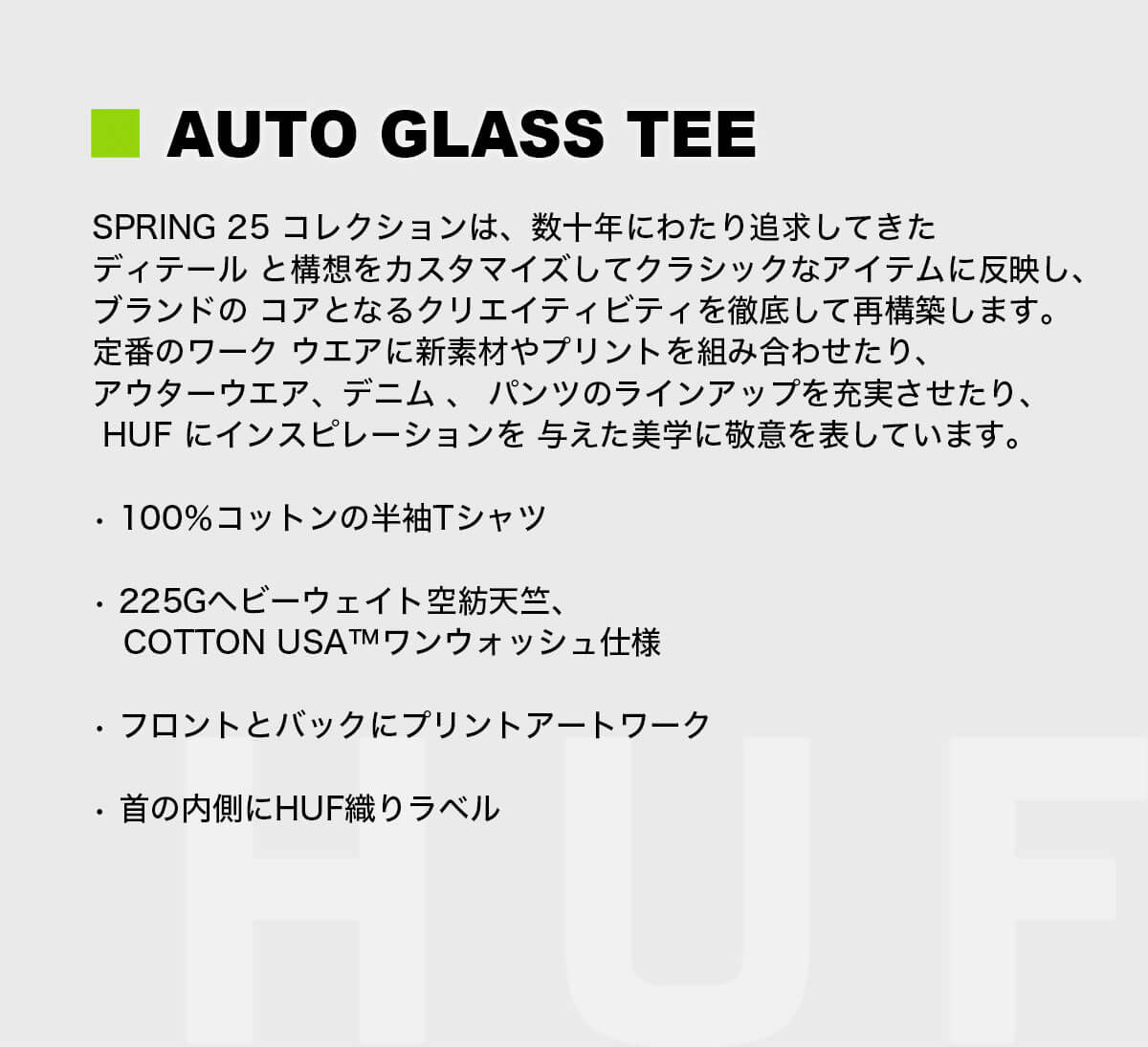 【国内正規取扱店】 HUF|ハフ AUTO GLASS TEE 【TS02413】 SPRING 25 コレクションは、数十年にわたり追求してきたディテール と構想をカスタマイズしてクラシックなアイテムに反映し、ブランドの コアとなるクリエイティビティを徹底して再構築します。 定番のワーク ウエアに新素材やプリントを組み合わせたり、アウターウエア、デニム 、 パンツのラインアップを充実させたり、 HUF にインスピレーションを 与えた美学に敬意を表しています。 ・100%コットンの半袖Tシャツ ・225Gヘビーウェイト空紡天竺、COTTON USA?ワンウォッシュ仕様 ・フロントとバックにプリントアートワーク ・首の内側にHUF織りラベル ・ウエストバンドの内側にカスタムCROMER織りラベル ◆素材:100% Cotton ◆カラー:ホワイト / コバルトブルー ◆サイズ:L / XL ◆品番 :TS02413