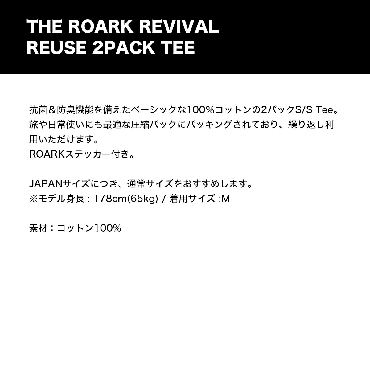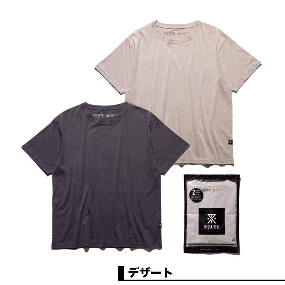 【国内正規取扱店】 THE ROARK REVIVAL REUSE 2PACK TEE 【RTJPK1000】 抗菌&防臭機能を備えたベーシックな100%コットンの2パックS/S Tee。 旅や日常使いにも最適な圧縮パックにパッキングされており、繰り返し利用いただけます。 ROARKステッカー付き。 JAPANサイズにつき、通常サイズをおすすめします。 ◆カラー: ・ベーシック ・デザート ◆お取り扱いサイズ:M / L ◆品番:RTJPK1000 ◆素材:コットン100%