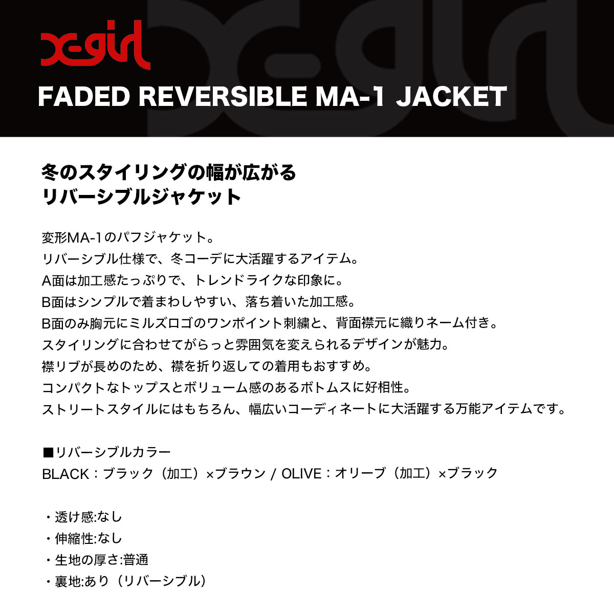 【検索キーワード】エックスガール レディース リバーシブルジャケット 変形MA-1 加工感 ビンテージ風 全2色 M ストリート人気ブランド X-GIRL 通販 2025 新作【105254021002】かわいい おしゃれ プレゼント 正規取扱い店【XGIRL】静岡県 静波 ジャックオーシャンスポーツ サーフボード スケートボード スノー アパレル 各種ブランド 正規取扱店 2025秋