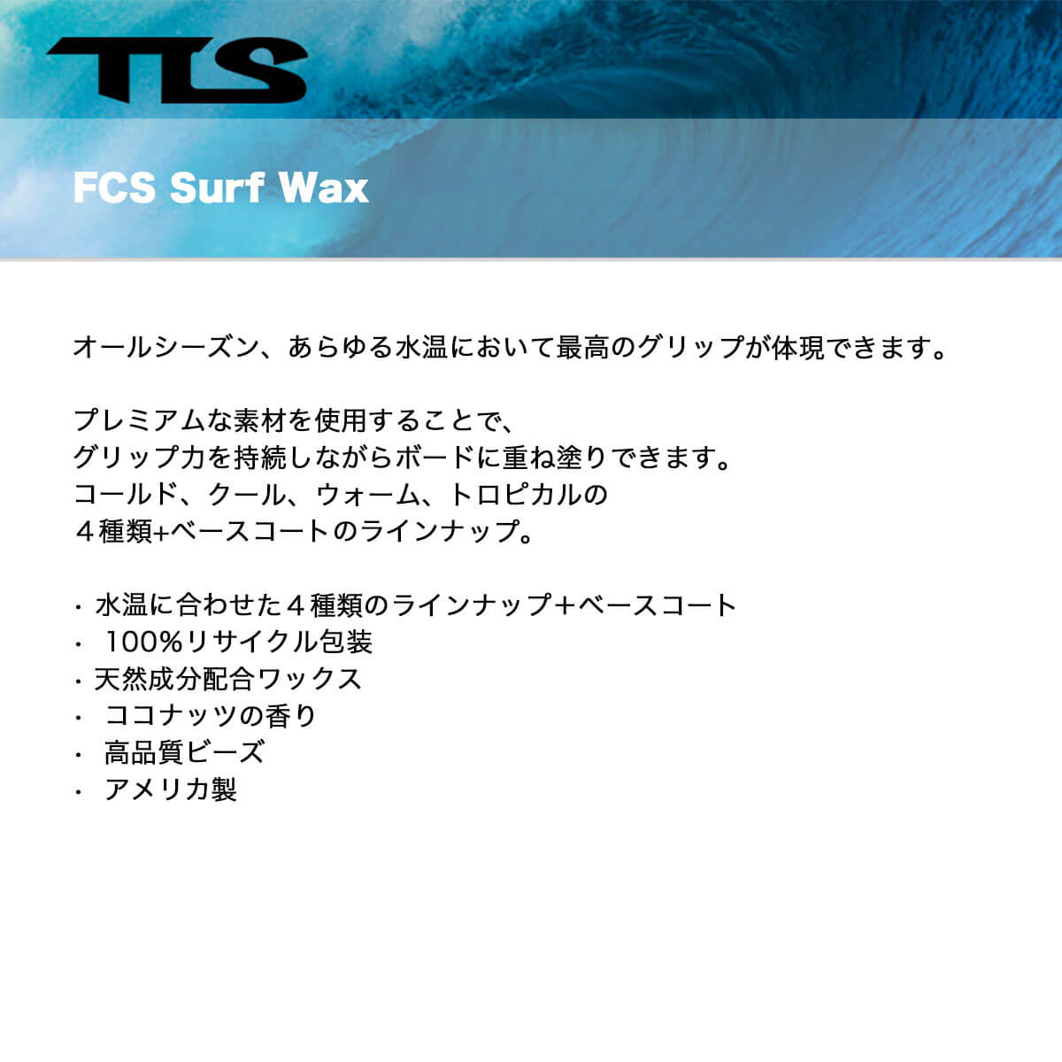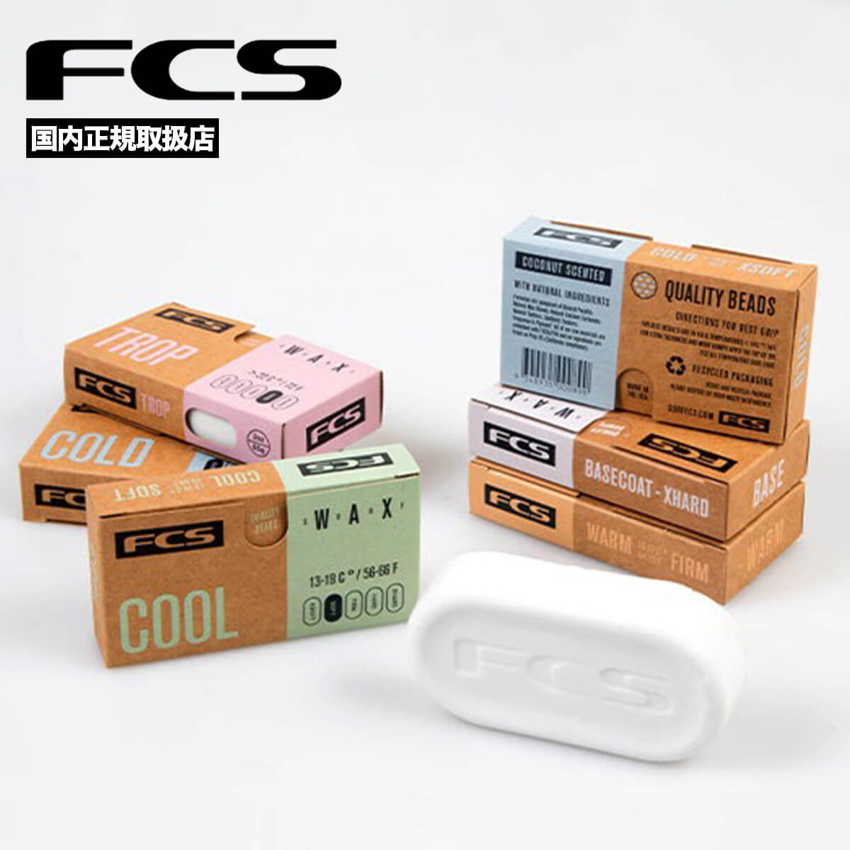 FCS Surf Waxは、オールシーズン・あらゆる水温で高いグリップ力を発揮するプレミアムサーフワックス。 重ね塗りしてもグリップが持続し、安定したライディングをサポートします。 水温に合わせて選べる「コールド/クール/ウォーム/トロピカル」の4種類に、ベースコートを加えたラインナップ。 天然成分配合、ココナッツの香り、100%リサイクル包装を採用した、アメリカ製高品質ワックスです。 ? アメリカ製