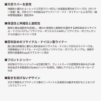 リサイクル素材のライナーを施した、機能性に優れたネオプレン不使用の3ミリ/2.5ミリ厚のユーレックス天然ラバー85%/合成ラバー15%(ポリマー含量)製ウェットスーツ。天然ラバーの供給元はプリファード・バイ・ネイチャーによるFSC(森林管理協議会)認証済み。16℃?18℃の水温に最適(※米国カリフォルニア基準、日本ではプラス約5℃目安)。フェアトレード・サーティファイドの工場で製造