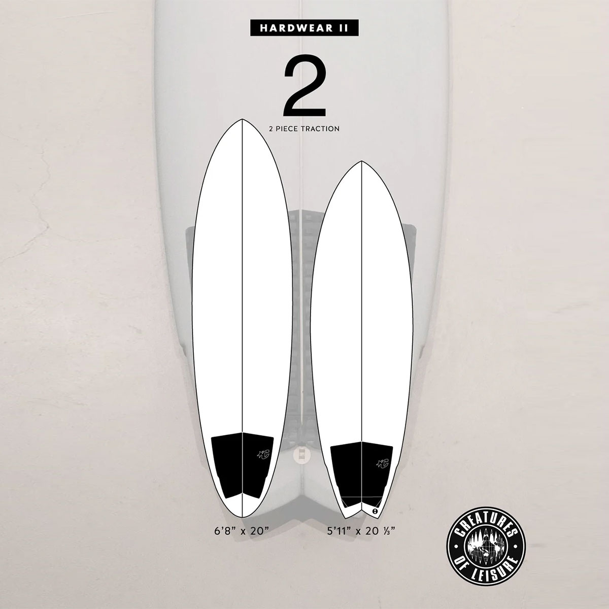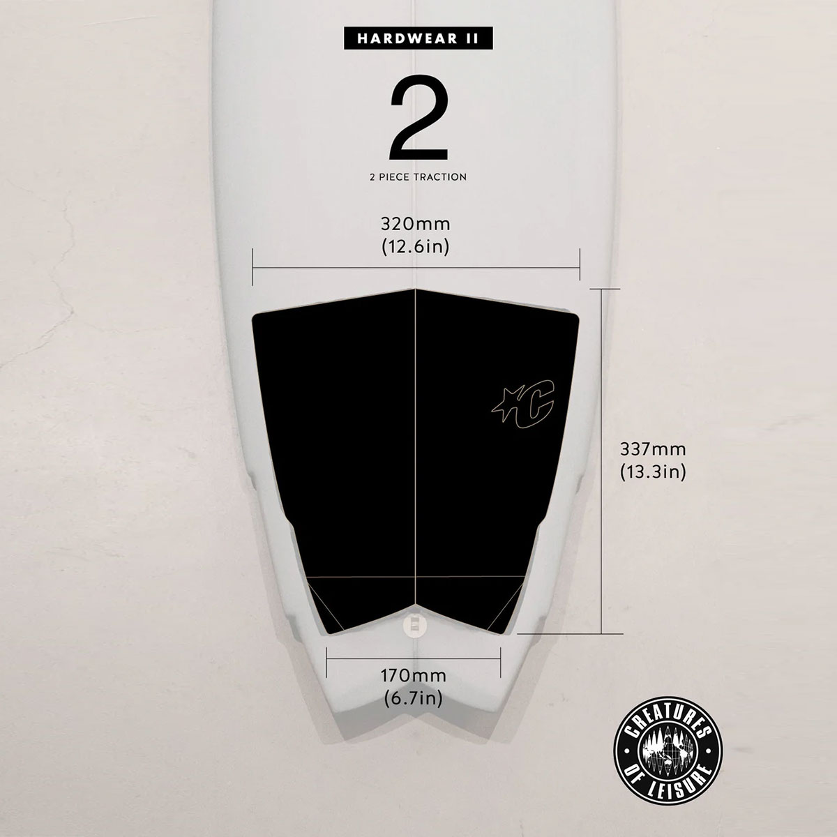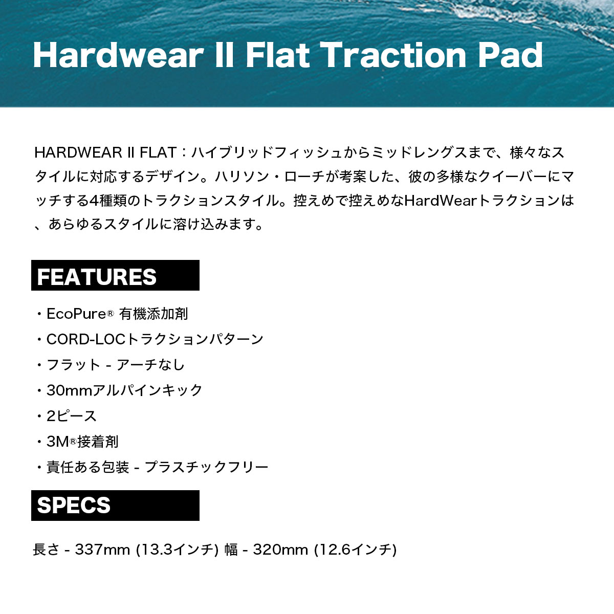 【国内正規取扱店】 Creatures of Leisure (クリエーチャーズ オブ レジャー) Hardwear II Flat Traction Pad 【GH225BK】 HARDWEAR II FLAT:ハイブリッドフィッシュからミッドレングスまで、様々なスタイルに対応するデザイン。ハリソン・ローチが考案した、彼の多様なクイーバーにマッチする4種類のトラクションスタイル。控えめで控えめなHardWearトラクションは、あらゆるスタイルに溶け込みます。 ■特徴: ・EcoPure 有機添加剤 ・CORD-LOCトラクションパターン ・フラット - アーチなし ・30mmアルパインキック ・2ピース ・3M接着剤 ・責任ある包装 - プラスチックフリー ■スペック:長さ - 337mm (13.3インチ) 幅 - 320mm (12.6インチ) ■カラー:ブラック