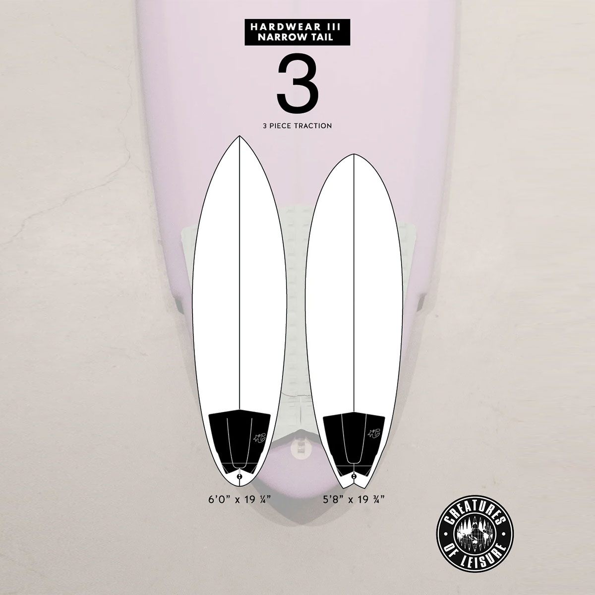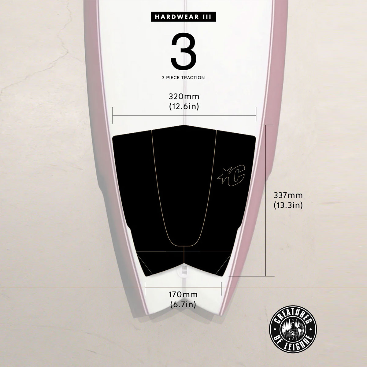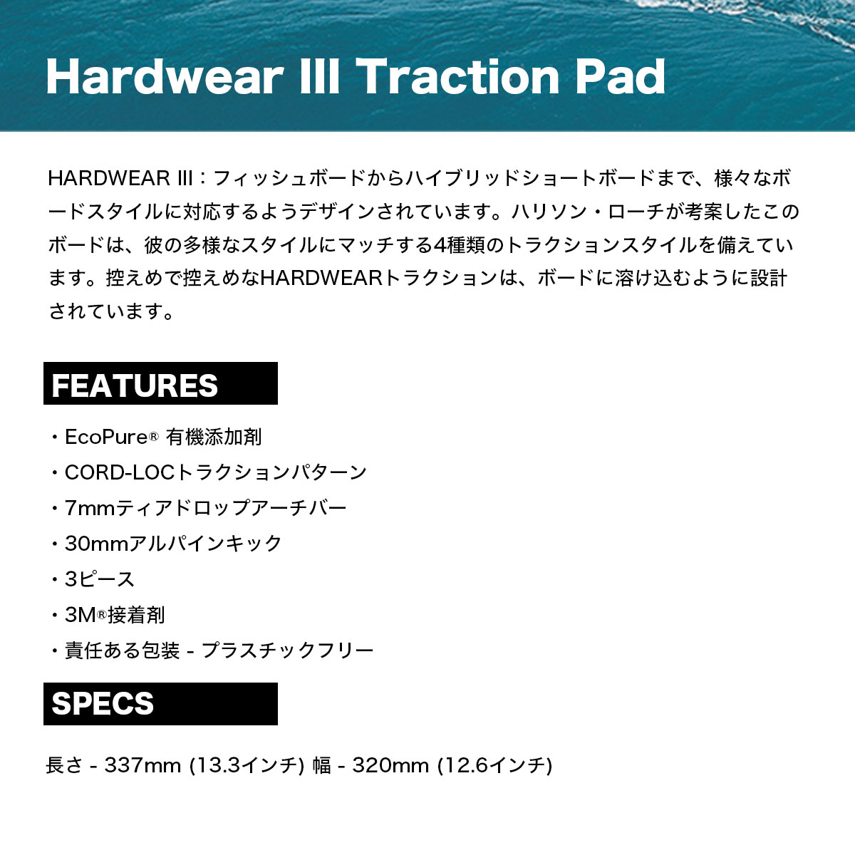 【国内正規取扱店】 Creatures of Leisure (クリエーチャーズ オブ レジャー) Hardwear III Traction Pad 【GH325】 HARDWEAR III:フィッシュボードからハイブリッドショートボードまで、様々なボードスタイルに対応するようデザインされています。ハリソン・ローチが考案したこのボードは、彼の多様なスタイルにマッチする4種類のトラクションスタイルを備えています。控えめで控えめなHARDWEARトラクションは、ボードに溶け込むように設計されています。 ■特徴: ・EcoPure 有機添加剤 ・CORD-LOCトラクションパターン ・7mmティアドロップアーチバー ・30mmアルパインキック ・3ピース ・3M接着剤 ・責任ある包装 - プラスチックフリー ■スペック:長さ - 337mm (13.3インチ) 幅 - 320mm (12.6インチ) ■カラー:ブラック / ボーン