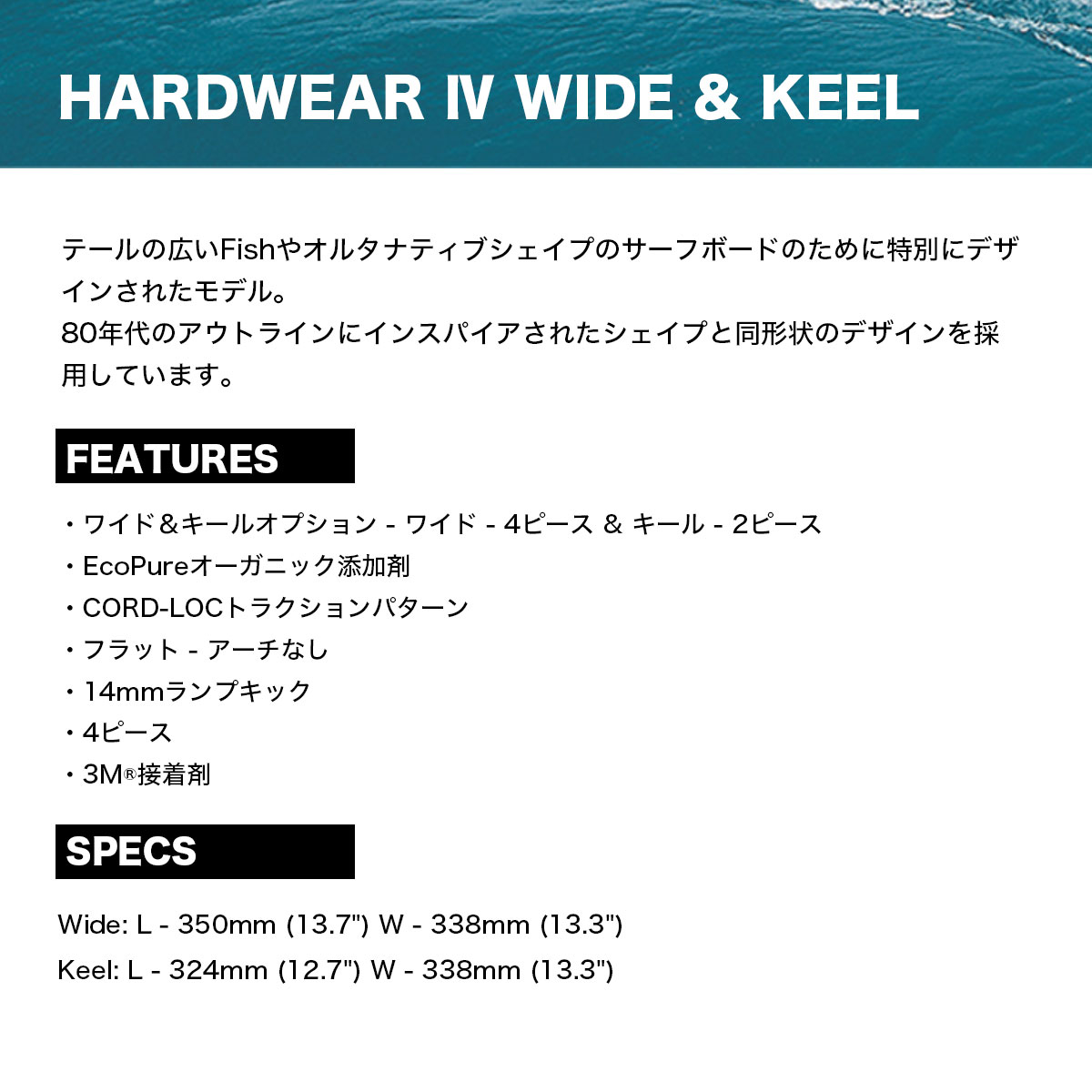 【国内正規取扱店】 Creatures of Leisure (クリエーチャーズ オブ レジャー) HARDWEAR 4 WIDE&KEEL 【GH425BK】 テールの広いFishやオルタナティブシェイプのサーフボードのために特別にデザインされたモデル。 80年代のアウトラインにインスパイアされたシェイプと同形状のデザインを採用しています。 ■特徴: ・EcoPure 有機添加剤 ・WIDE & KEEL Option ・CORD-LOC Traction Pattern ・4PIECE ・3M接着剤 ・責任ある包装 - プラスチックフリー ■スペック: Wide: L - 350mm (13.7") W - 338mm (13.3") Keel: L - 324mm (12.7") W - 338mm (13.3") ■カラー:ブラック