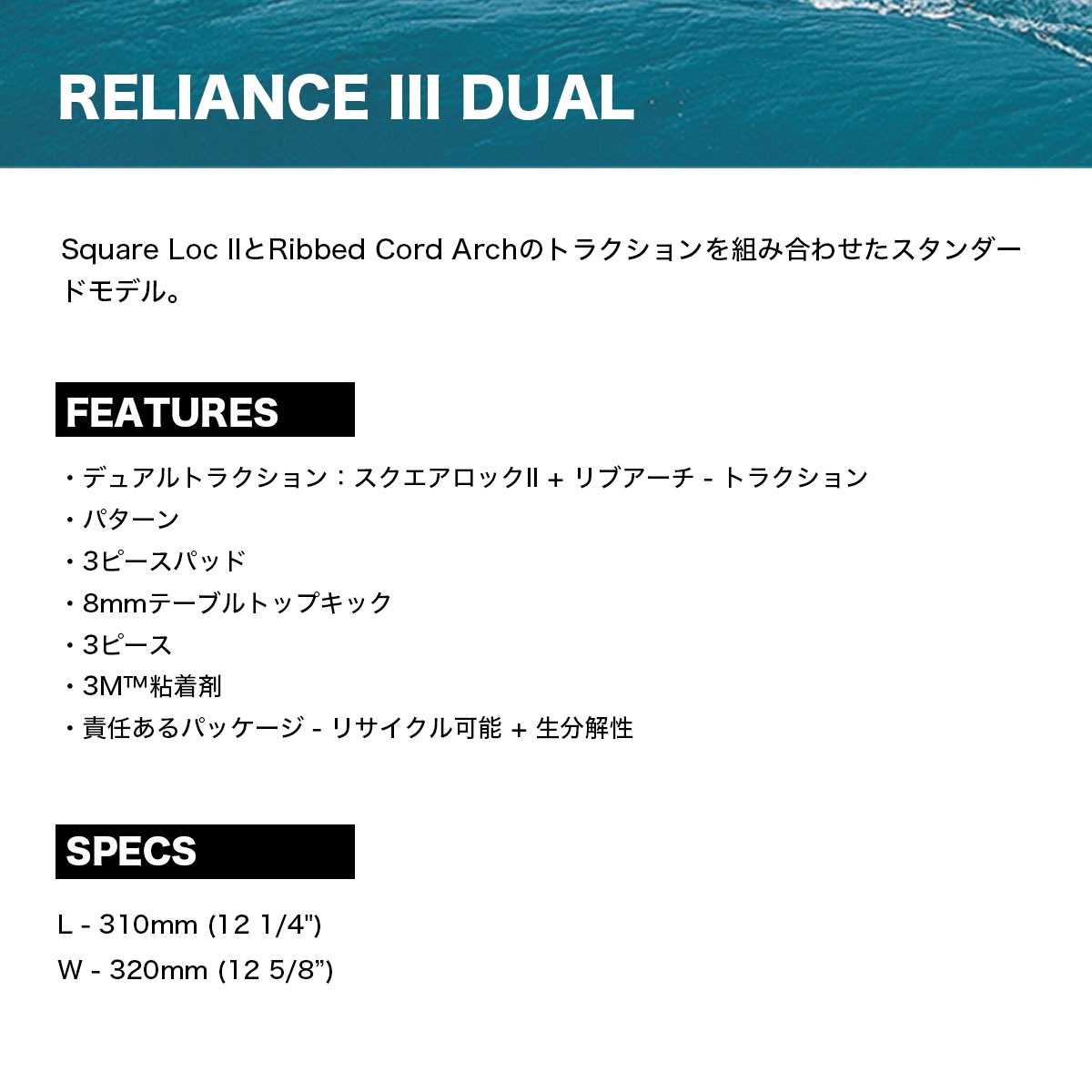 【国内正規取扱店】 Creatures of Leisure (クリエーチャーズ オブ レジャー) RELIANCE III DUAL 【GR3D22BK】 Square Loc IIとRibbed Cord Archのトラクションを組み合わせたスタンダードモデル。 ・デュアルトラクション:スクエアロックII + リブアーチ - トラクション ・パターン ・3ピースパッド ・8mmテーブルトップキック ・3ピース ・3M粘着剤 ・責任あるパッケージ - リサイクル可能 + 生分解性 ■スペック: L - 310mm (12 1/4") W - 320mm (12 5/8”) ■カラー:ブラック