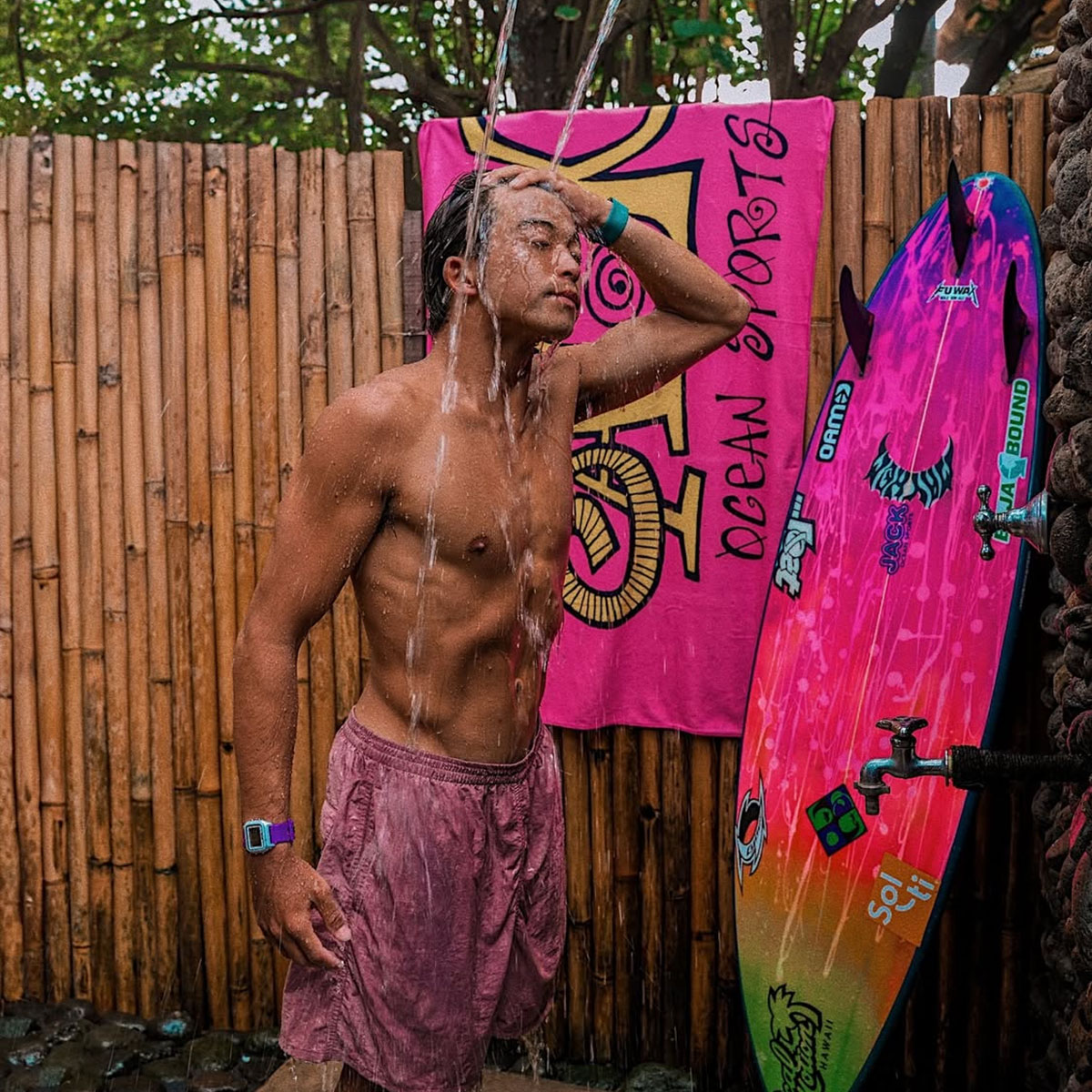 ポリエステル100%のスポーツタオル。耐久性に優れ、色落ち・型崩れしにくく、あらゆるスポーツ時の使用に最適です。 大判なので、サーフィン後の冷えた身体を柔らかく包み込みます。