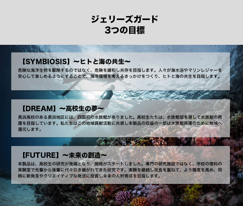 ●愛媛県立長浜高校水族館部の皆さんによる、刺胞動物(クラゲや珊瑚等)の刺胞射出メカニズムの研究成果をもとに生まれた「ジェリーズガード」