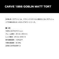 【国内正規取扱店】 CARVE | カーブ GOBLIN MATT TORT 【1866】【1869】 GOBLIN(ゴブリン)は、クラシックスタイルと飽きのこないモダンシェイプが組み合わさったロングセラーシリーズ。 ■カラー:ブラウン / ブラック ■仕様: 100% UVプロテクション フレーム素材:ポリカーボネイト レンズ素材:ポリカーボネイト 紫外線透過率:1.0%以下 可視光透過率:8-18% LENS CATEGORY 3