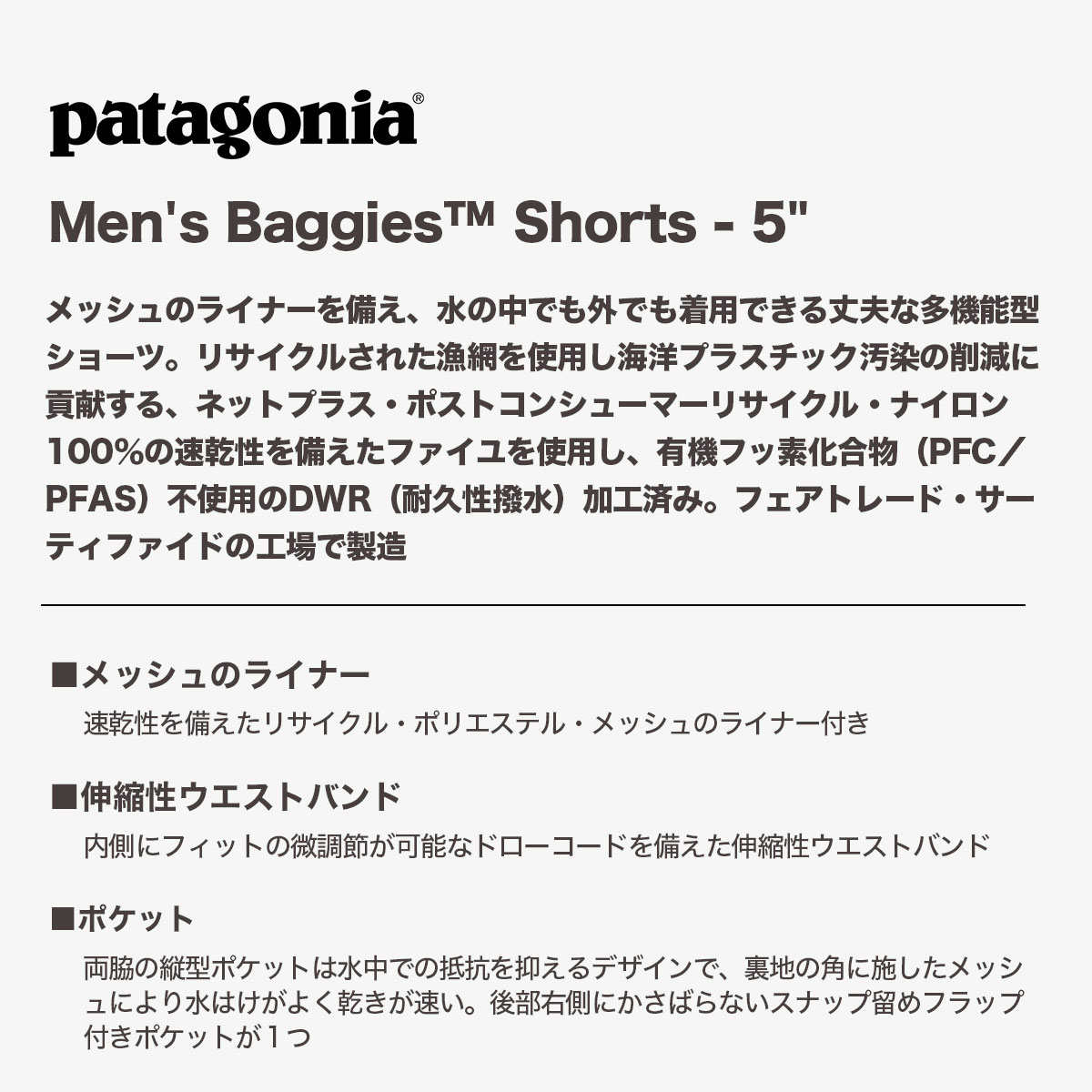 【検索キーワード】Patagonia パタゴニア 水着 メンズ・バギーズ・ショーツ 5インチ 伸縮 速乾 ポケット 全11色 普段着 おしゃれ 海 サーフィン プール 山 アウトドア 旅行 街 プレゼント 人気 ブランド 通販 2025 新作【57022】 おすすめ オススメ オシャレ シンプル カジュアル かっこいい 定番 アウトドア マリンスポーツ プレゼント 静岡県 静波 ジャックオーシャンスポーツ サーフボード スケートボード スノー アパレル Patagonia他 各種ブランド 正規取扱店