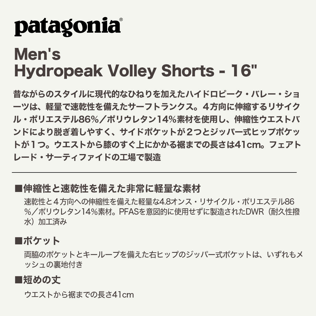 【検索キーワード】Patagonia パタゴニア 短パン ハーフパンツ 速乾 撥水 軽量 メンズ・ハイドロピーク・バレー・ショーツ 16インチ 全7色 普段着 おしゃれ 海 サーフィン プール 山 アウトドア 人気 ブランド 通販【86436】 おすすめ オススメ オシャレ シンプル カジュアル かっこいい 定番 アウトドア マリンスポーツ プレゼント 静岡県 静波 ジャックオーシャンスポーツ サーフボード スケートボード スノー アパレル Patagonia他 各種ブランド 正規取扱店