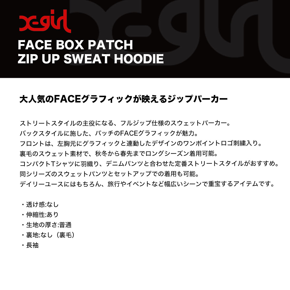 【検索キーワード】エックスガール レディース ジップパーカー スウェット フード フェイスロゴ 全3色 S M ストリート人気ブランド X-GIRL 2025 新作 | FACE BOX PATCH ZIP UP SWEAT HOODIE【105253012005】かわいい おしゃれ プレゼント 正規取扱い店【XGIRL】静岡県 静波 ジャックオーシャンスポーツ サーフボード スケートボード スノー アパレル 各種ブランド 正規取扱店 2025秋