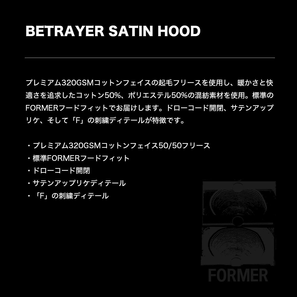 プレミアム320GSMコットンフェイスの起毛フリースを使用し、暖かさと快適さを追求したコットン50%、ポリエステル50%の混紡素材を使用。標準のFORMERフードフィットでお届けします。ドローコード開閉、サテンアップリケ、そして「F」の刺繍ディテールが特徴です
