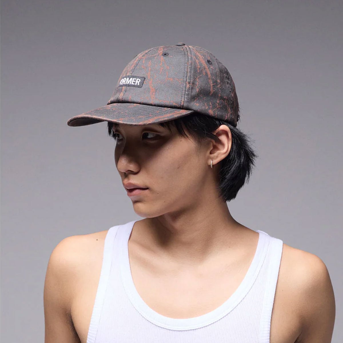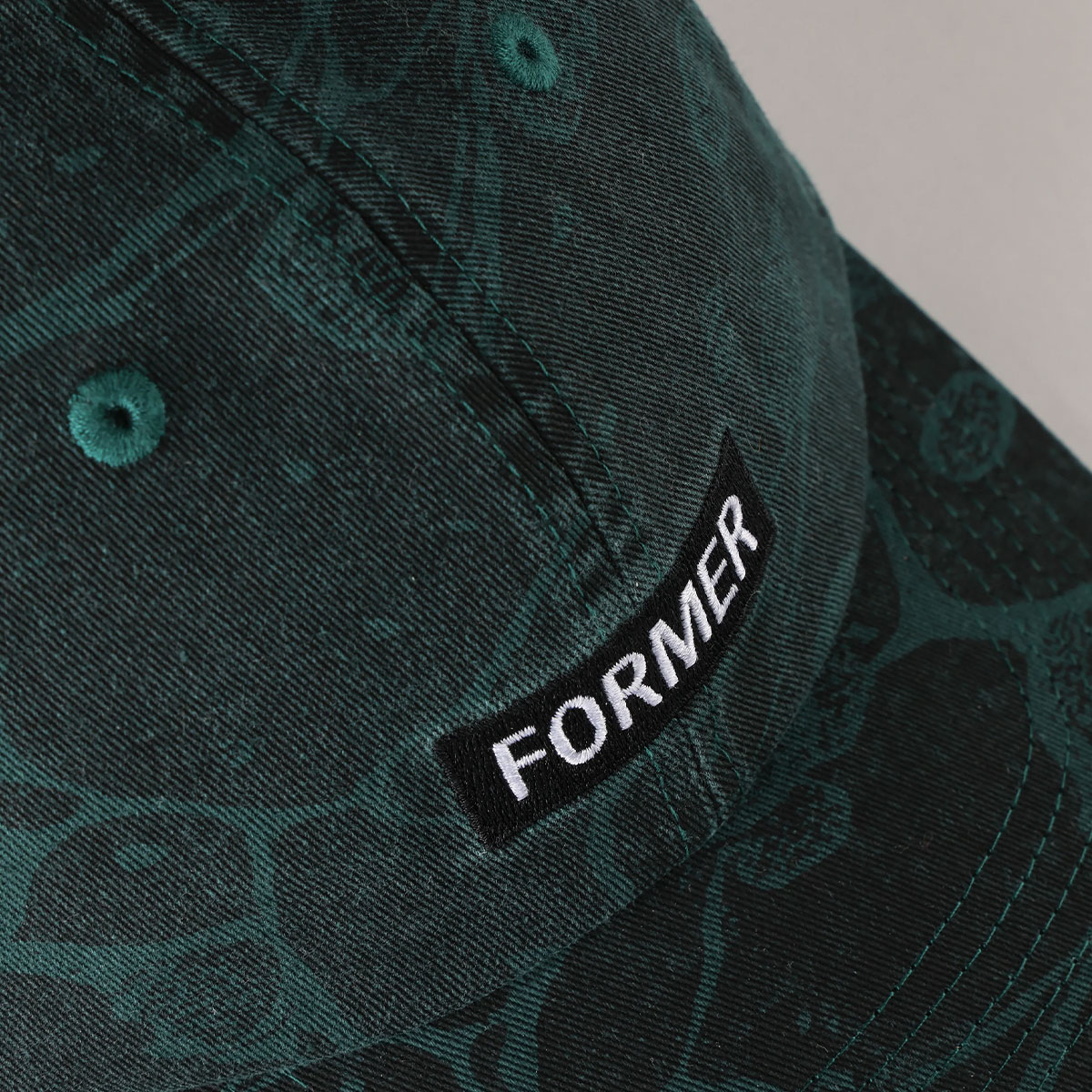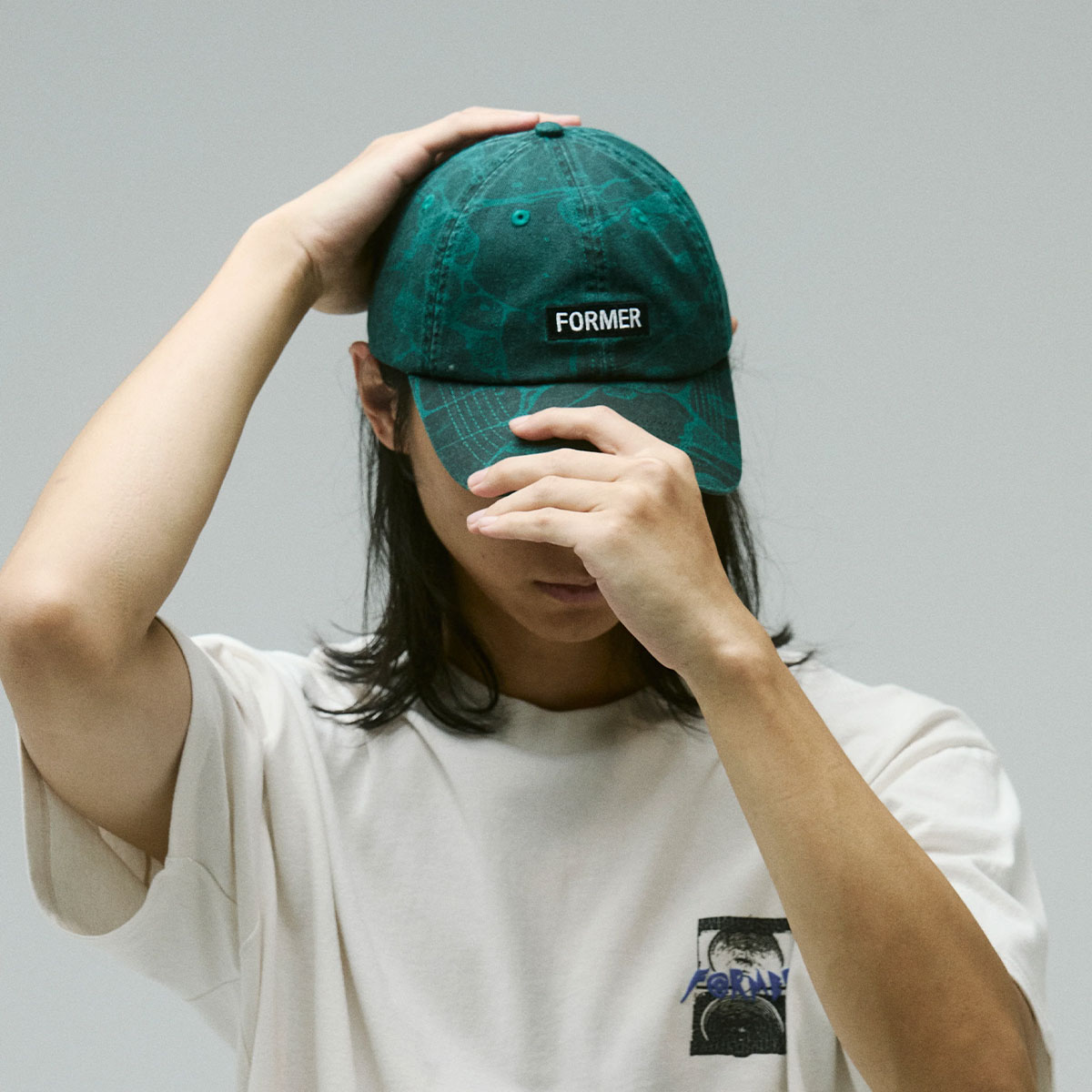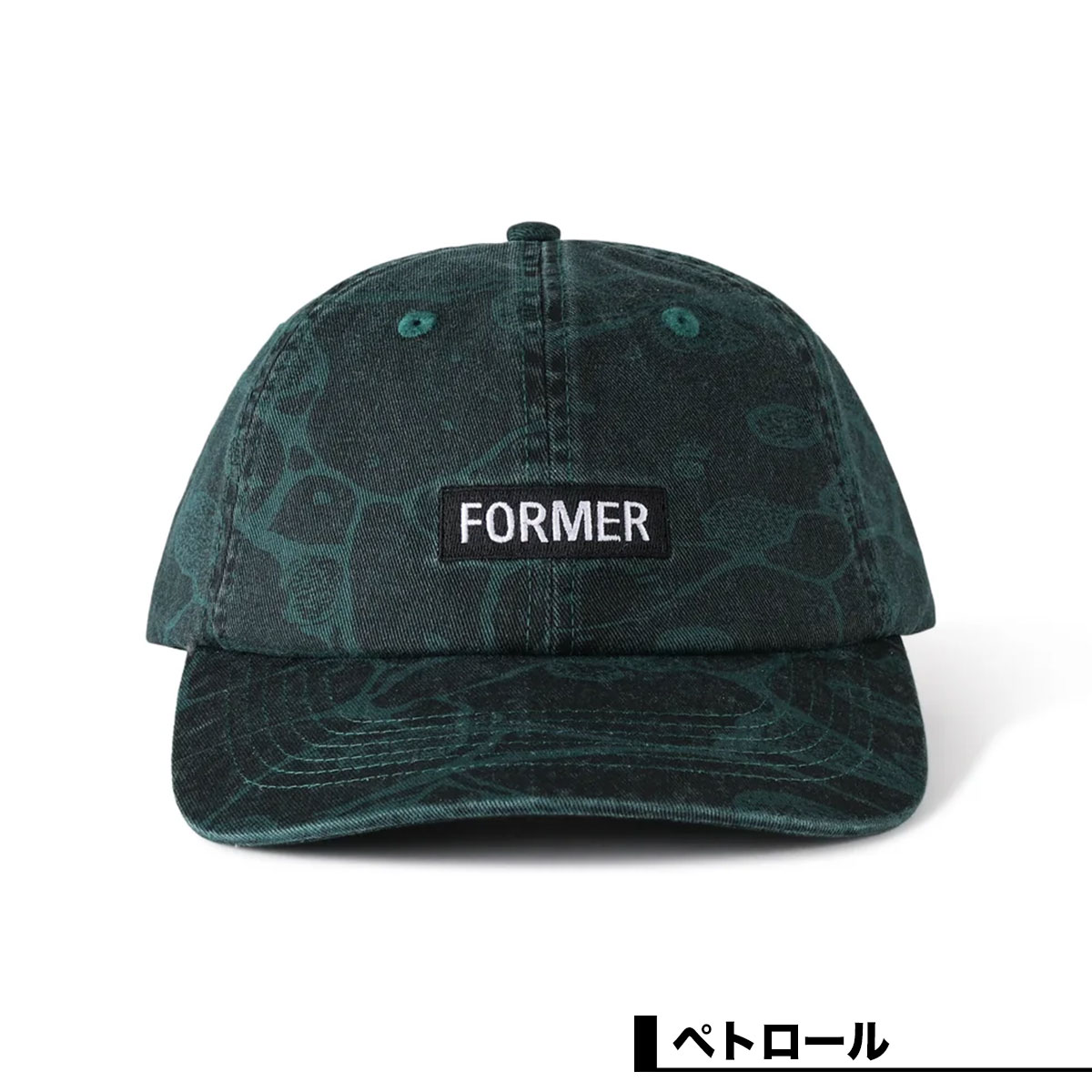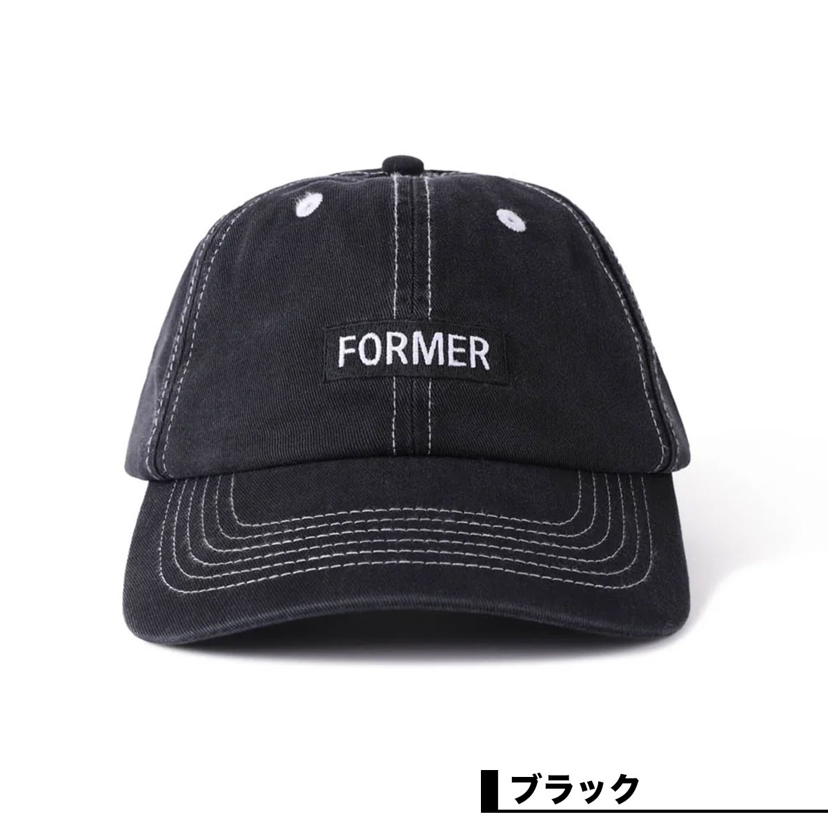 快適な100%コットンツイル素材を使用し、ヴィンテージウォッシュ仕上げのカーブピーク6パネルキャップです。フロントにグラフィック刺繍、キャップ背面にシグネチャーFORMERローズリベット、フランチャイズFロゴ入りメタルクラスプとOリングクロージャーが特徴です。
