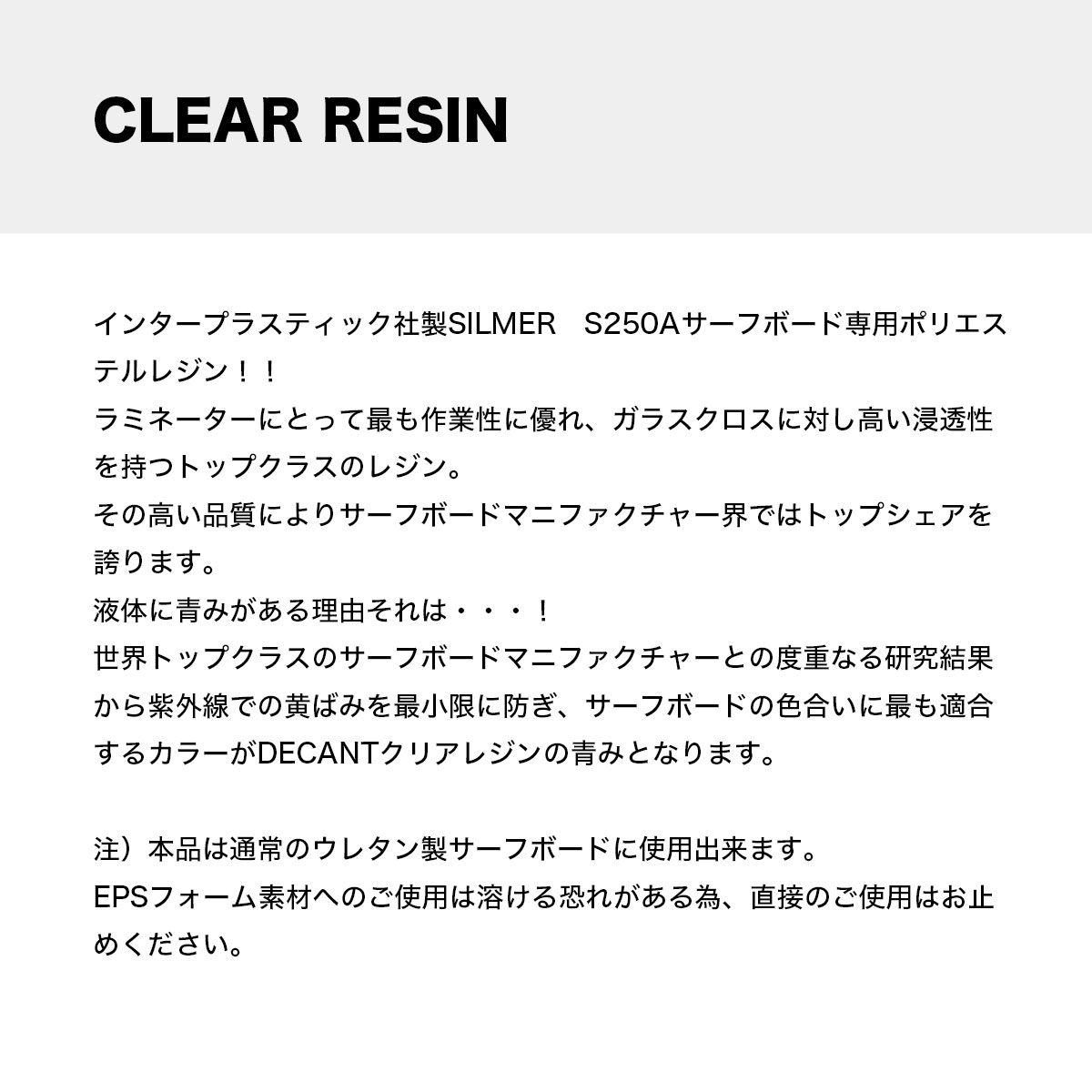 ラミネーターにとって最も作業性に優れ、ガラスクロスに対し高い浸透性を持つトップクラスのレジン。 その高い品質によりサーフボードマニファクチャー界ではトップシェアを誇ります。 液体に青みがある理由それは・・・! 世界トップクラスのサーフボードマニファクチャーとの度重なる研究結果から紫外線での黄ばみを最小限に防ぎ、サーフボードの色合いに最も適合するカラーがDECANTクリアレジンの青みとなります。