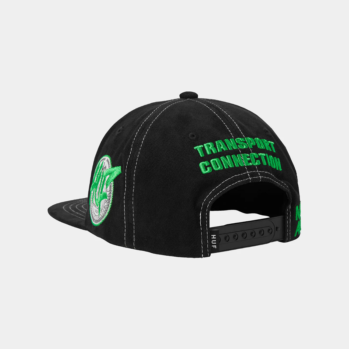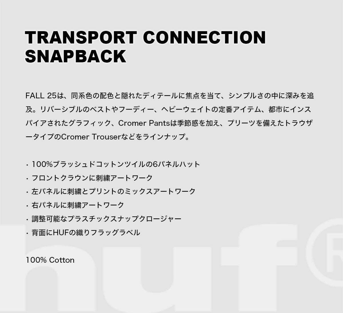 【国内正規取扱店】 HUF|ハフ TRANSPORT CONNECTION SNAPBACK 【HT00886】 FALL 25は、同系色の配色と隠れたディテールに焦点を当て、シンプルさの中に深みを追及。リバーシブルのベストやフーディー、ヘビーウェイトの定番アイテム、都市にインスパイアされたグラフィック、Cromer Pantsは季節感を加え、プリーツを備えたトラウザータイプのCromer Trouserなど。 ・100%ブラッシュドコットンツイルの6パネルハット ・フロントクラウンに刺繍アートワーク ・左パネルに刺繍とプリントのミックスアートワーク ・右パネルに刺繍アートワーク ・調整可能なプラスチックスナップクロージャー ・背面にHUFの織りフラッグラベル ■カラー:ブラック ■サイズ:ONESIZE