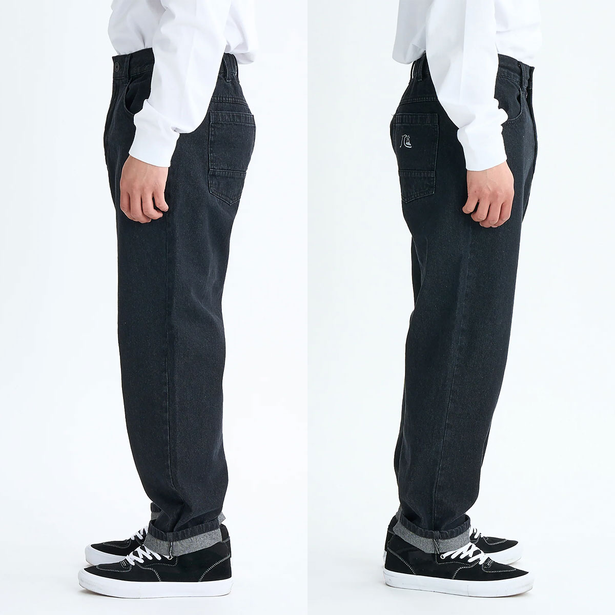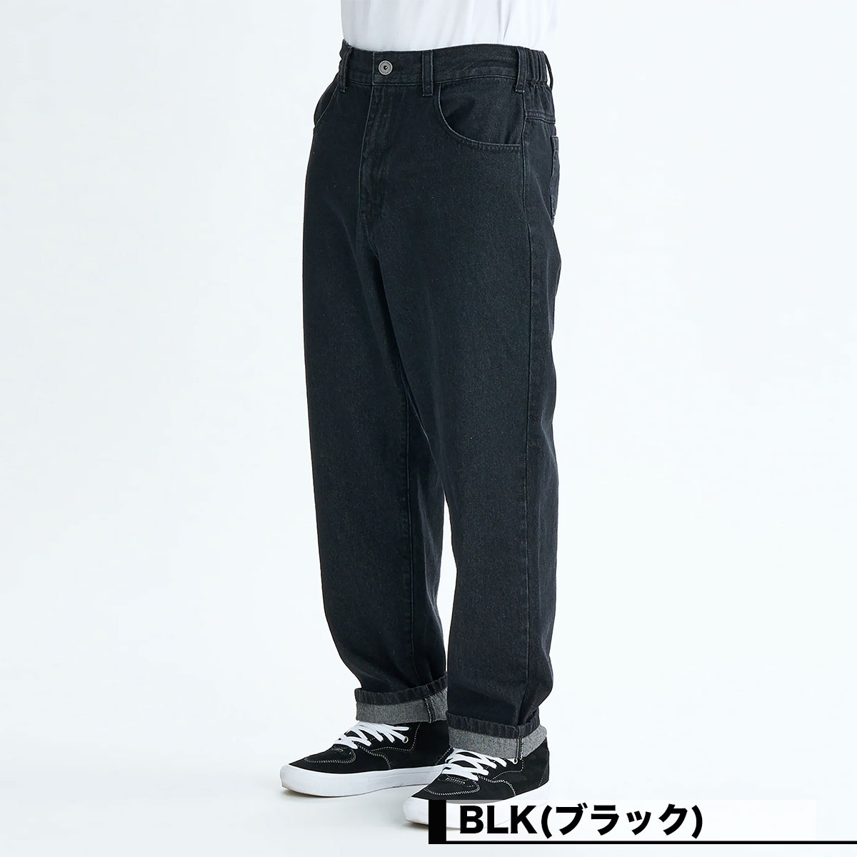 やや薄手(10.5オンス)で軽い着心地のデニムパンツ。ゴムシャーリング+ドローコード仕様で、フロントジップとベルトループも付いているので、イージーにもきれいめにも対応。バック右ポケットにバブルロゴを刺繍し、BLKはワンウォッシュ加工、GRYはユーズド加工。加工特有の裾のアタリが無くならないようレングスはサイズごとに短めに設計して裾上げ要らず。絶妙なテーパードとゆとりのあるルーズフィットはサーファー仕様の拘りのシルエットです。