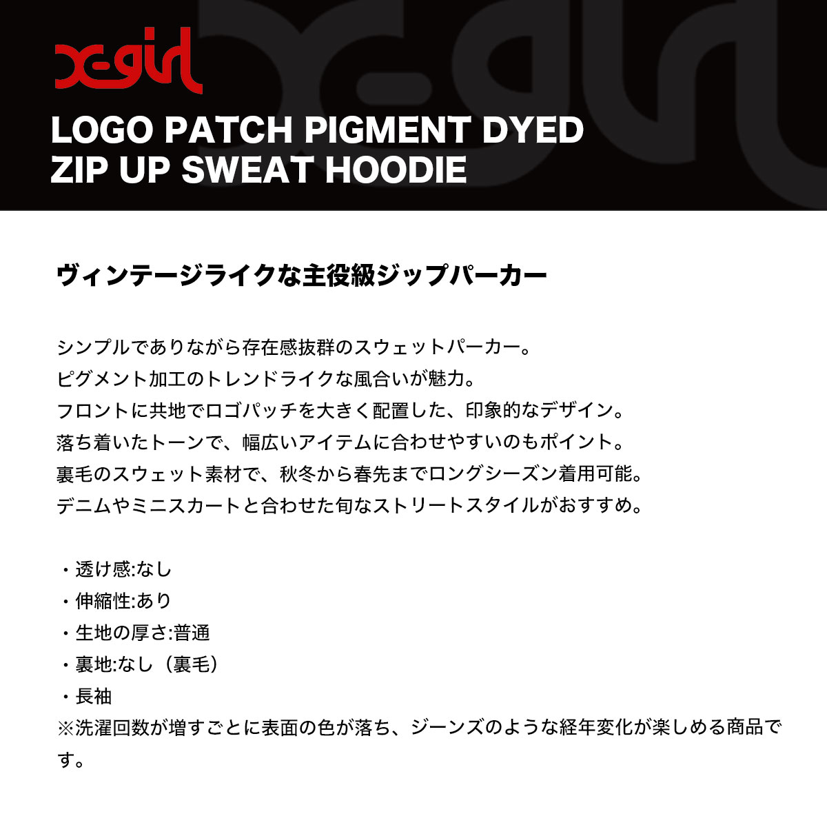 【検索キーワード】エックスガール レディース ジップパーカー スウェット フード ヴィンテージ加工 全3色 S M ストリート人気ブランド X-GIRL 通販 2025 新作【105253012015】かわいい おしゃれ プレゼント 正規取扱い店【XGIRL】静岡県 静波 ジャックオーシャンスポーツ サーフボード スケートボード スノー アパレル 各種ブランド 正規取扱店 2025秋