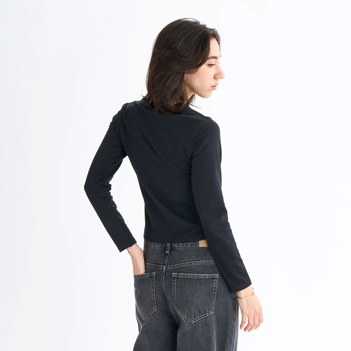 ベア天竺の伸び感のある素材で、ぴったりとしたタイトシルエットのロングスリーブトップス。フロントにはROXYロゴをラインストーンで表現した一着です。ハイウエストボトムと合わせるとグッドバランスに着こなせます。シンプルなデザインなので、インナーとしても活躍してくれます。