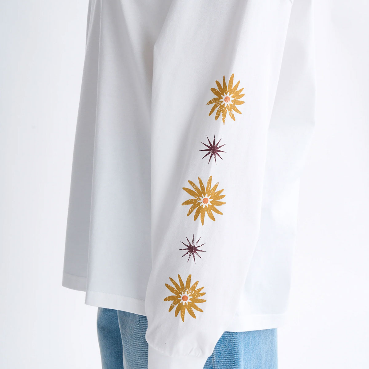 ゆったりシルエットで少しワイドな袖が特徴のロングスリーブトップス。バックにはフラワーモチーフのグラフィックとメッセージを大きくプリントし,袖にもフラワーモチーフをあしらいました。一枚でサッとスタイリングしてもサマになる一着です。袖口はリブで仕上げています。