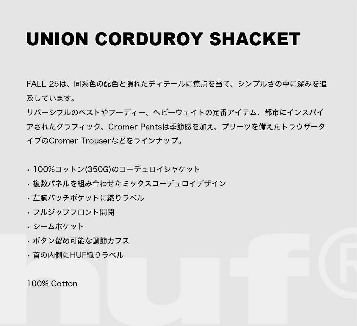 【検索キーワード】HUF ハフ ジャケット アウター メンズ レディース コーデュロイ スケートボード スケーター 人気ブランド 通販 新作 2025 | UNION CORDUROY SHACKET【BU00251】オススメ オシャレ シンプル カジュアル かっこいい 定番 アウトドア マリンスポーツ プレゼント 静岡県 静波 ジャックオーシャンスポーツ サーフボード スケートボード スノー アパレル patagonia他 各種ブランド 正規取扱店