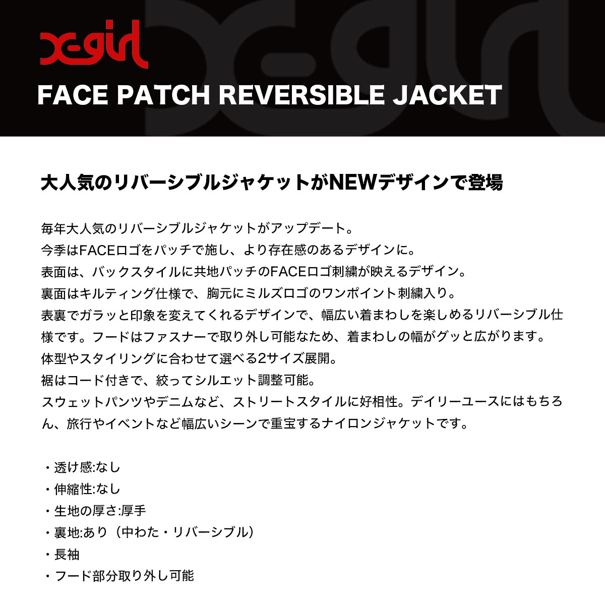 【検索キーワード】エックスガール レディース リバーシブル ジャケット アウター キルティング フード取り外し可 全3色 S M ストリート人気ブランド X-GIRL 通販 2025 新作【105253021006】かわいい おしゃれ プレゼント 正規取扱い店【XGIRL】静岡県 静波 ジャックオーシャンスポーツ サーフボード スケートボード スノー アパレル 各種ブランド 正規取扱店 2025秋