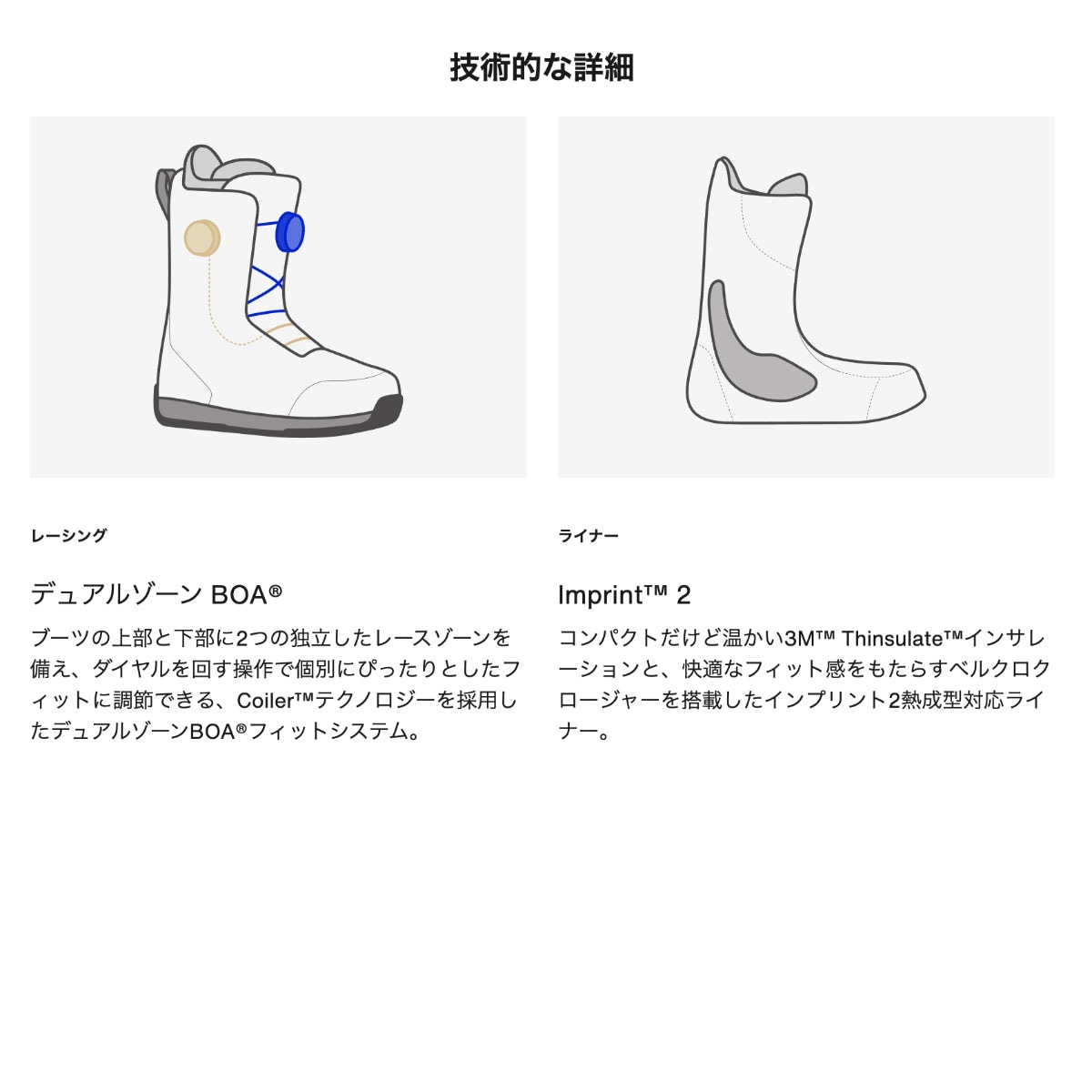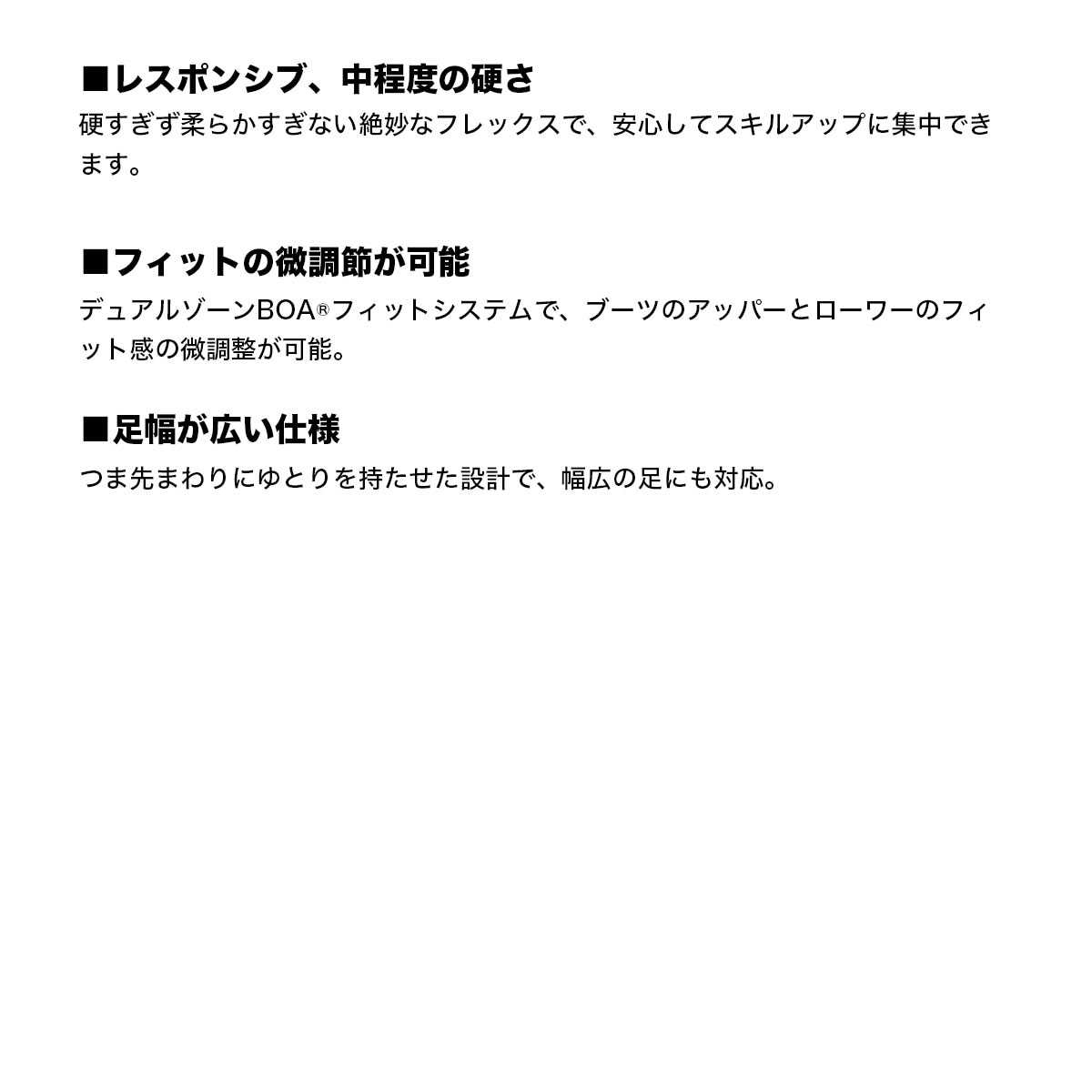 BOAフィットシステム採用ワイドスノーボードブーツ。 足を包み込むような快適性、ミディアムフレックス、最適なフィットに調節可能なデュアルゾーンBOAフィットシステム。