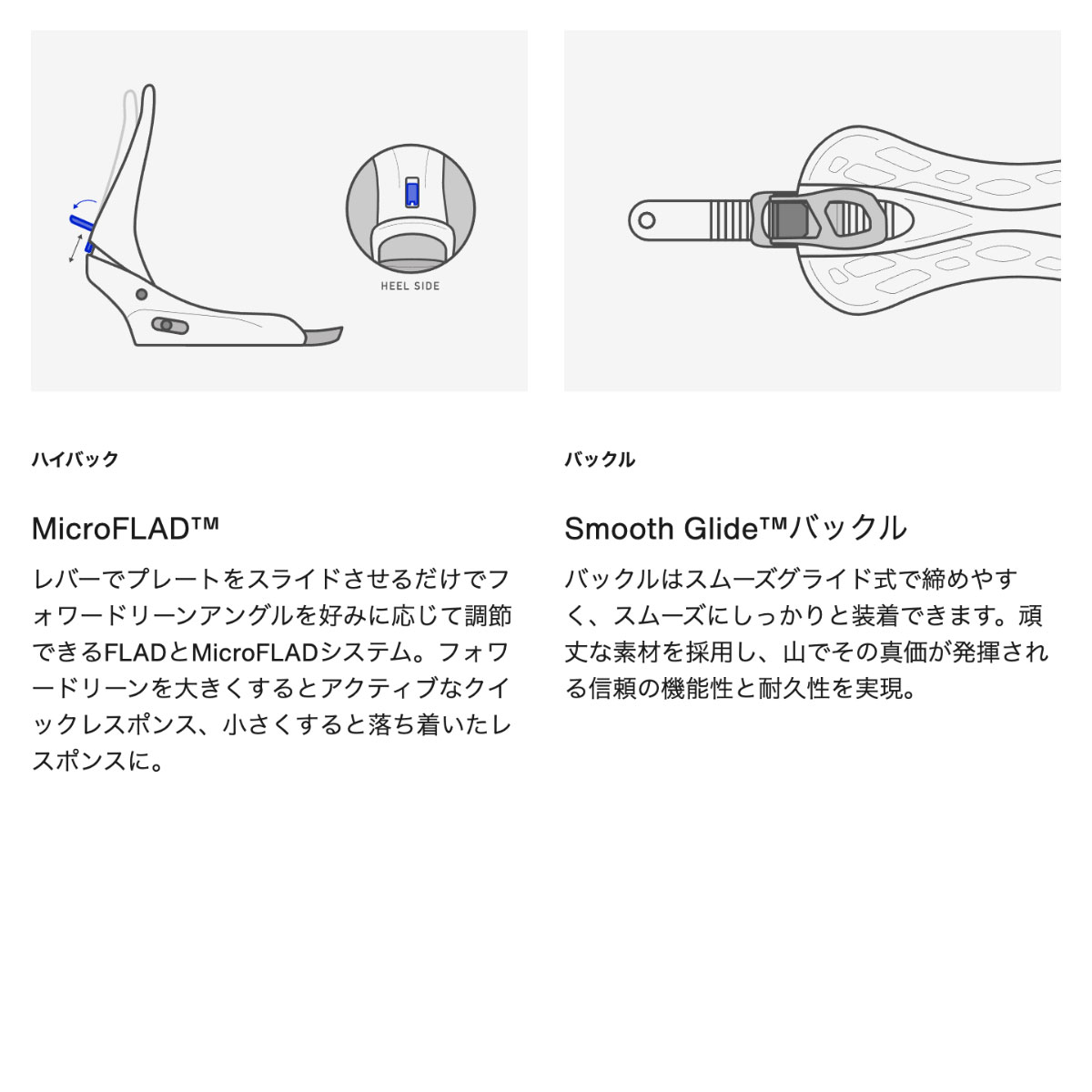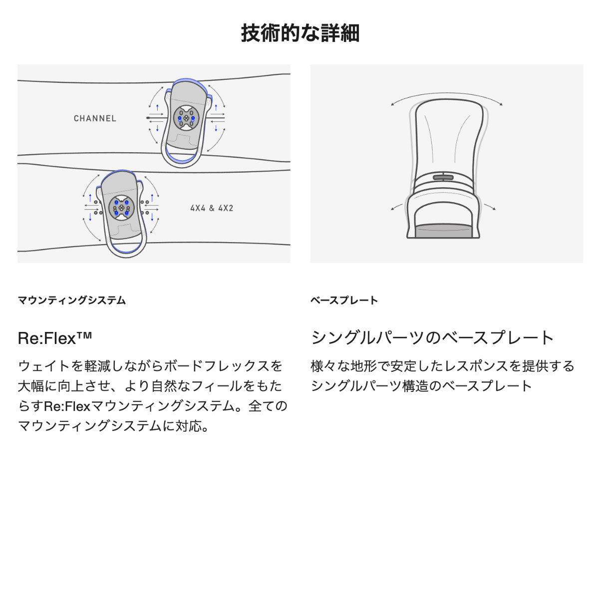 Re:Flex スノーボードバインディング。 ゆったりとしたフレックスと一日中快適な装着感を提供する、ユニバーサル対応モデル。