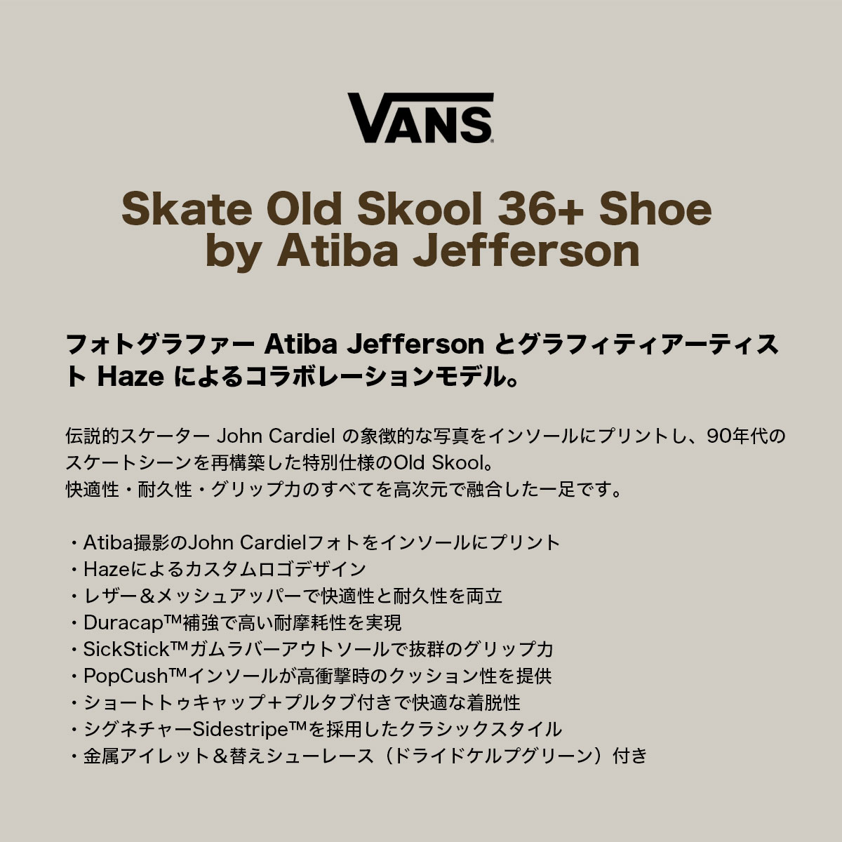 伝説的スケーター John Cardiel の象徴的な写真をインソールにプリントし、90年代のスケートシーンを再構築した特別仕様のOld Skool。 快適性・耐久性・グリップ力のすべてを高次元で融合した一足です。