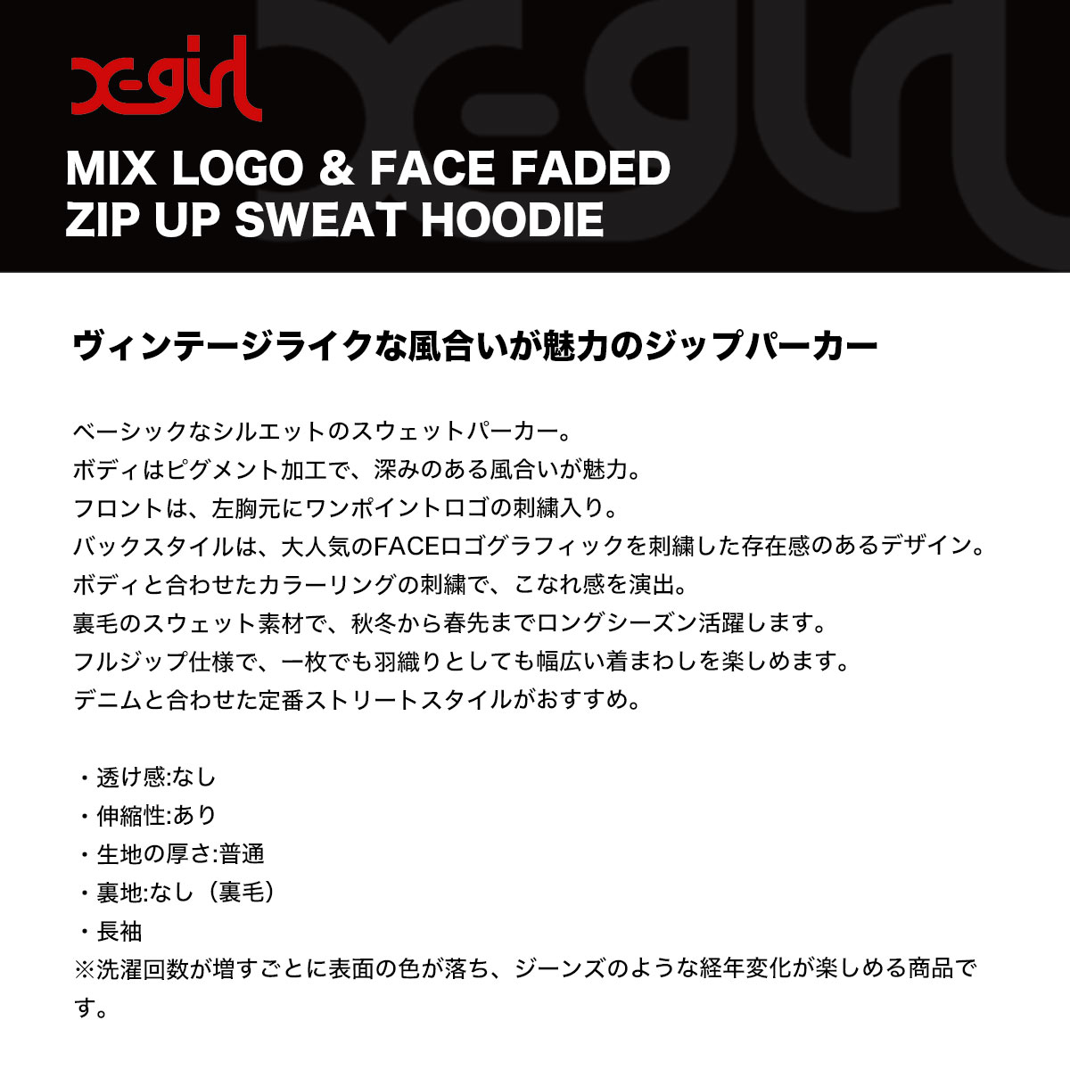 【検索キーワード】エックスガール レディース ジップパーカー スウェット フード ヴィンテージ加工 フェイスロゴ ブラック S M ストリート人気ブランド X-GIRL 通販 2025 新作【105254012017】かわいい おしゃれ プレゼント 正規取扱い店【XGIRL】静岡県 静波 ジャックオーシャンスポーツ サーフボード スケートボード スノー アパレル 各種ブランド 正規取扱店 2025秋
