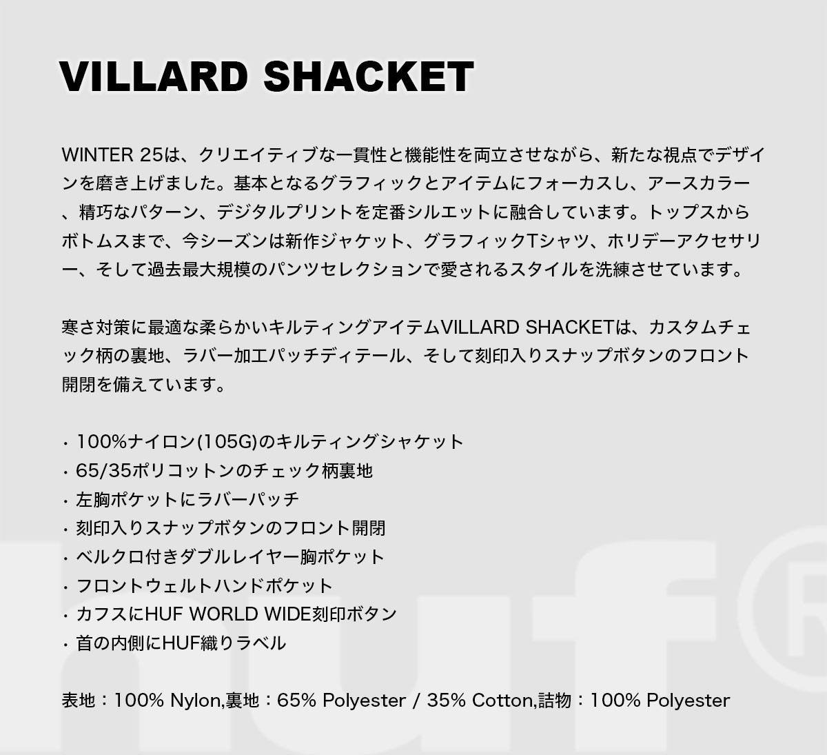 【検索キーワード】HUF ハフ キルティングジャケット シャケット メンズ レディース L スケートボード スケーター 人気ブランド 通販 新作 2025 | VILLARD SHACKET【BU00254】オススメ オシャレ シンプル カジュアル かっこいい 定番 アウトドア マリンスポーツ プレゼント 静岡県 静波 ジャックオーシャンスポーツ サーフボード スケートボード スノー アパレル patagonia他 各種ブランド 正規取扱店