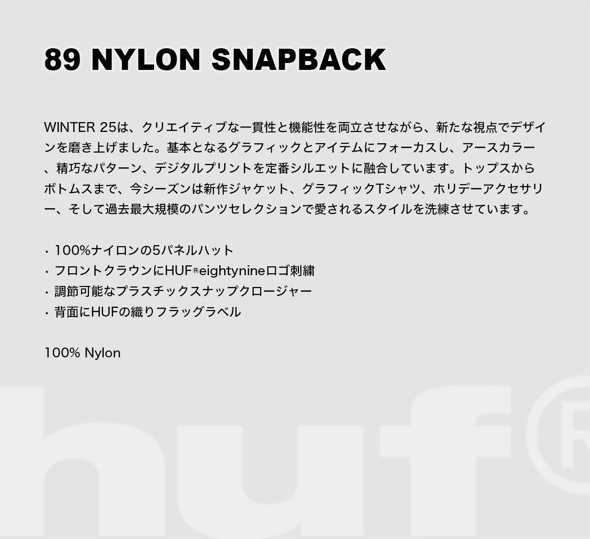 【検索キーワード】HUF ハフ キャップ 帽子 5パネル ナイロン ロゴ 刺繍 メンズ レディース スケートボード スケーター 人気ブランド 通販 新作 2025 | 89 NYLON SNAPBACK【HT00912】オススメ オシャレ シンプル カジュアル かっこいい 定番 アウトドア マリンスポーツ プレゼント 静岡県 静波 ジャックオーシャンスポーツ サーフボード スケートボード スノー アパレル patagonia他 各種ブランド 正規取扱店