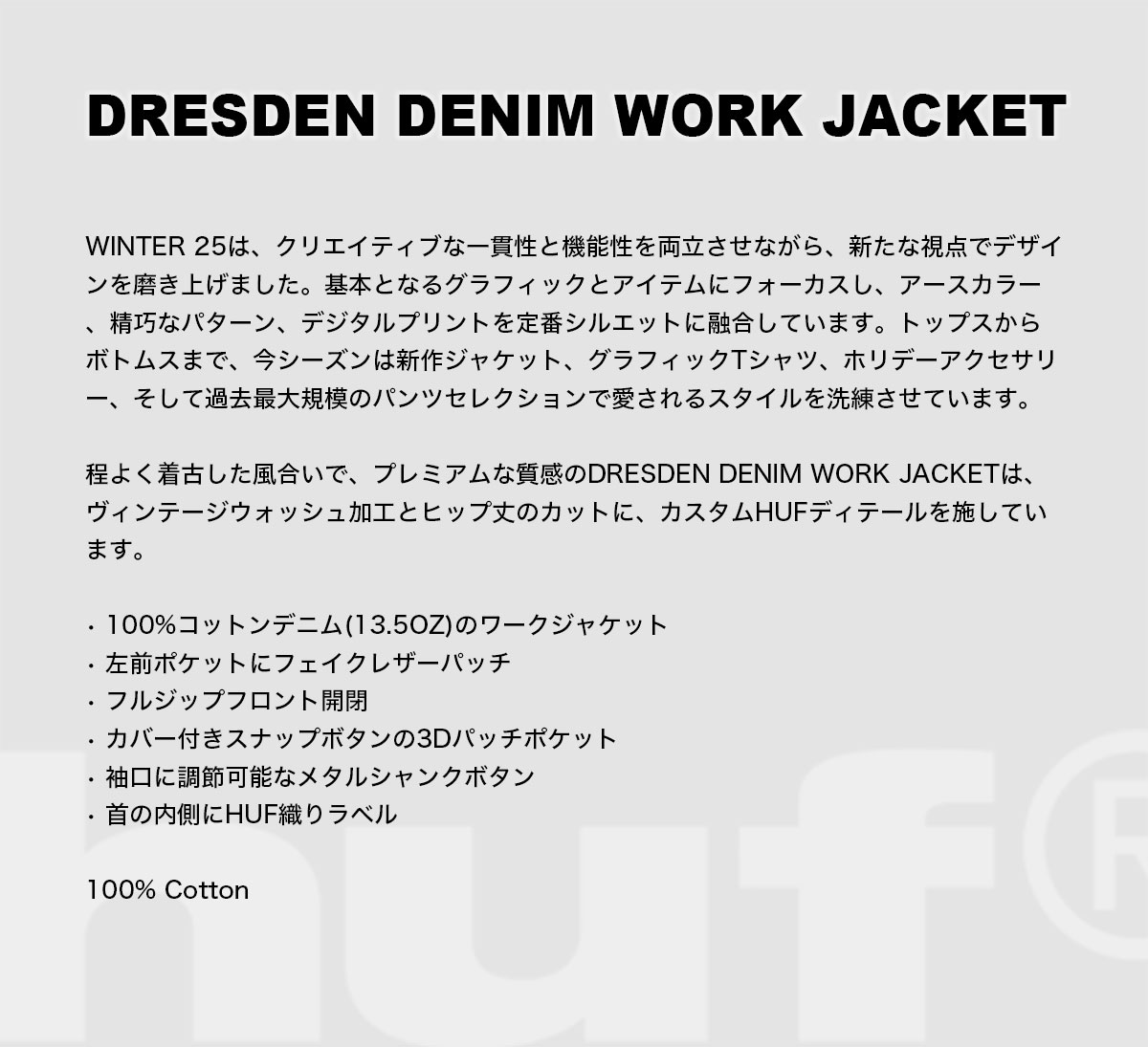 【検索キーワード】HUF ハフ デニム ワークジャケット アウター メンズ レディース L スケートボード スケーター 人気ブランド 通販 新作 2025 | DRESDEN DENIM WORK JACKET【JK00492】オススメ オシャレ シンプル カジュアル かっこいい 定番 アウトドア マリンスポーツ プレゼント 静岡県 静波 ジャックオーシャンスポーツ サーフボード スケートボード スノー アパレル patagonia他 各種ブランド 正規取扱店
