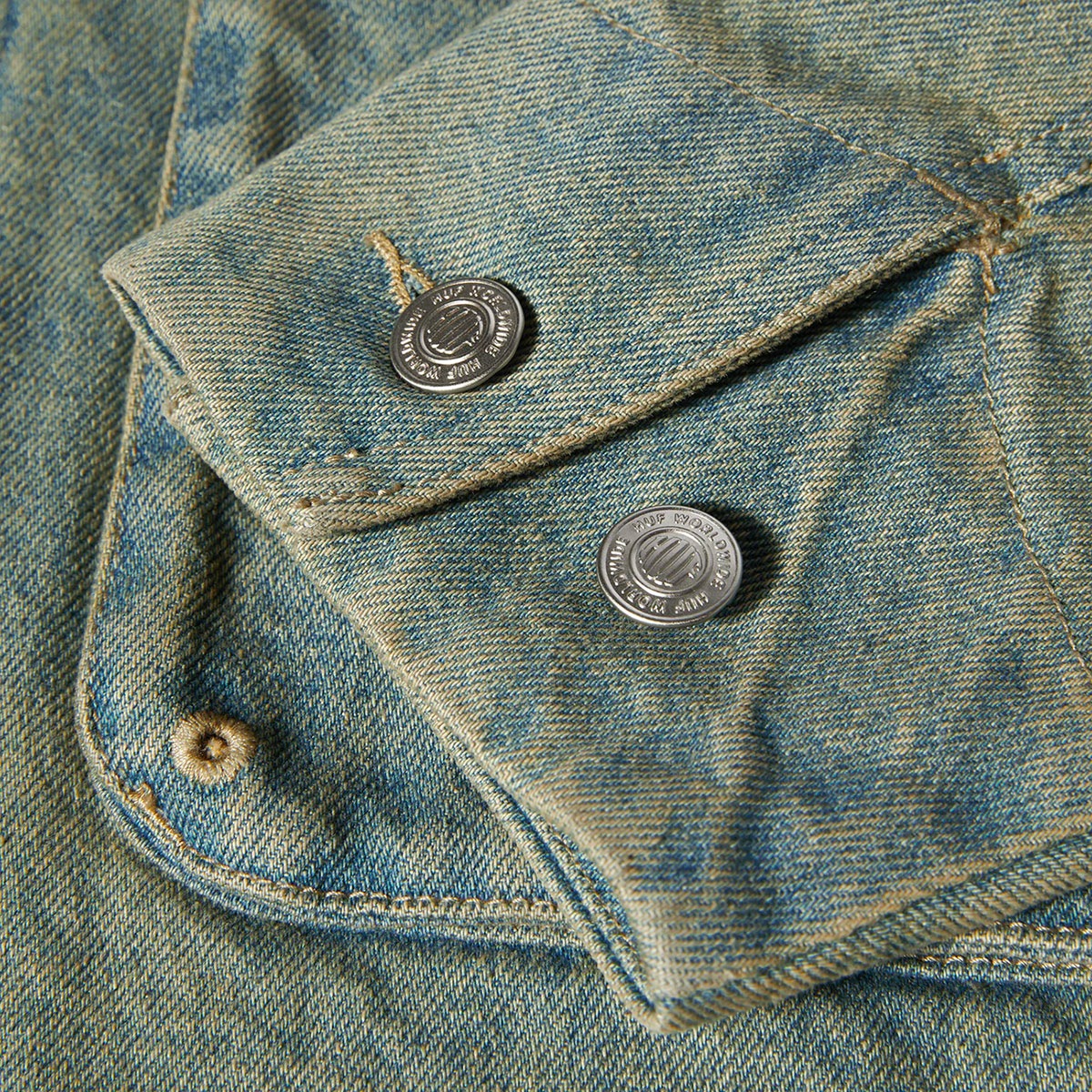 程よく着古した風合いで、プレミアムな質感のDRESDEN DENIM WORK JACKETは、ヴィンテージウォッシュ加工とヒップ丈のカットに、カスタムHUFディテールを施しています。