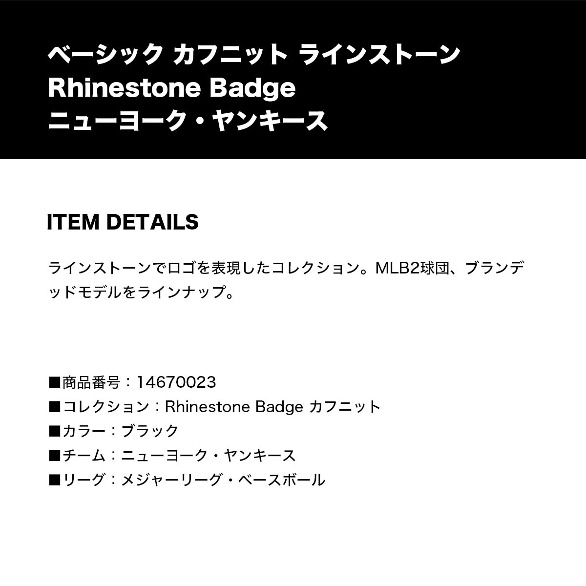 【国内正規取扱店】 NEW ERA | ニューエラ ベーシック カフニット ラインストーン Rhinestone Badge ニューヨーク・ヤンキース ラインストーンでロゴを表現したコレクション。MLB2球団、ブランデッドモデルをラインナップ。 ■カラー:ブラック ■お取り扱いサイズ:ONESIZE ■素材:アクリル ◆品番:14670023