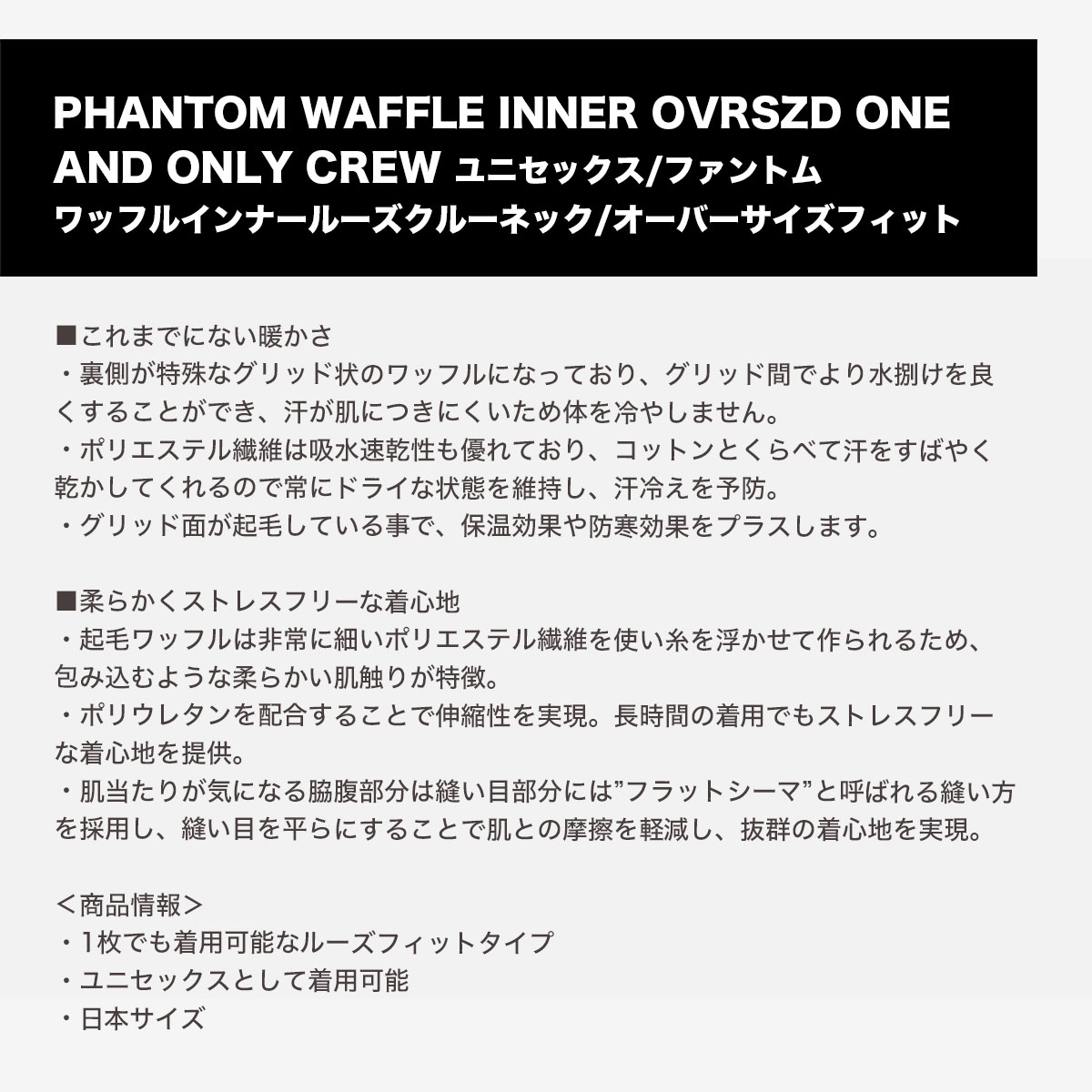 【国内正規取扱店】 HURLEY | ハーレー PHANTOM WAFFLE INNER OVRSZD ONE AND ONLY CREW ユニセックス/ファントムワッフルインナールーズクルーネック/オーバーサイズフィット 【MSWI252087】 秋冬の定番アイテム ワッフル形状が紡ぎ出す次世代インナー ・1枚でも着用可能なルーズフィットタイプ ・ユニセックスとして着用可能 ・日本サイズ ◆商品名:ファントム ワッフル インナー オーバーサイズ ワン アンド オンリー クルー ◆素材: ・本体:ポリエステル92% ポリウレタン8% ・リブ:ポリエステル95% ポリウレタン5% ◆カラー:BLK(ブラック) / OBS(ネイビー) / SKHK(グレー) ◆サイズ:S / M / L / XL ◆原産国:中国