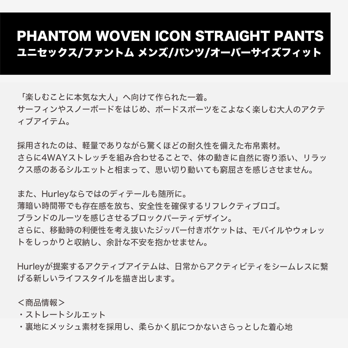 【国内正規取扱店】 HURLEY | ハーレー PHANTOM WOVEN ICON STRAIGHT PANTS メンズ/パンツ/オーバーサイズフィット 【MUBR252020】 「楽しむことに本気な大人」へ向けて作られた一着。 サーフィンやスノーボードをはじめ、ボードスポーツをこよなく楽しむ大人のアクティブアイテム。 ・ストレートシルエット ・裏地にメッシュ素材を採用し、柔らかく肌につかないさらっとした着心地 ◆商品名:ファントム ウーブン アイコン ストレート パンツ ◆素材: ・表地:ポリエステル88%ポリウレタン12% ・裏地:ポリエステル100% ◆カラー:BLK(ブラック) / SKHK(グレー) ◆サイズ:S / M / L / XL ◆原産国:中国