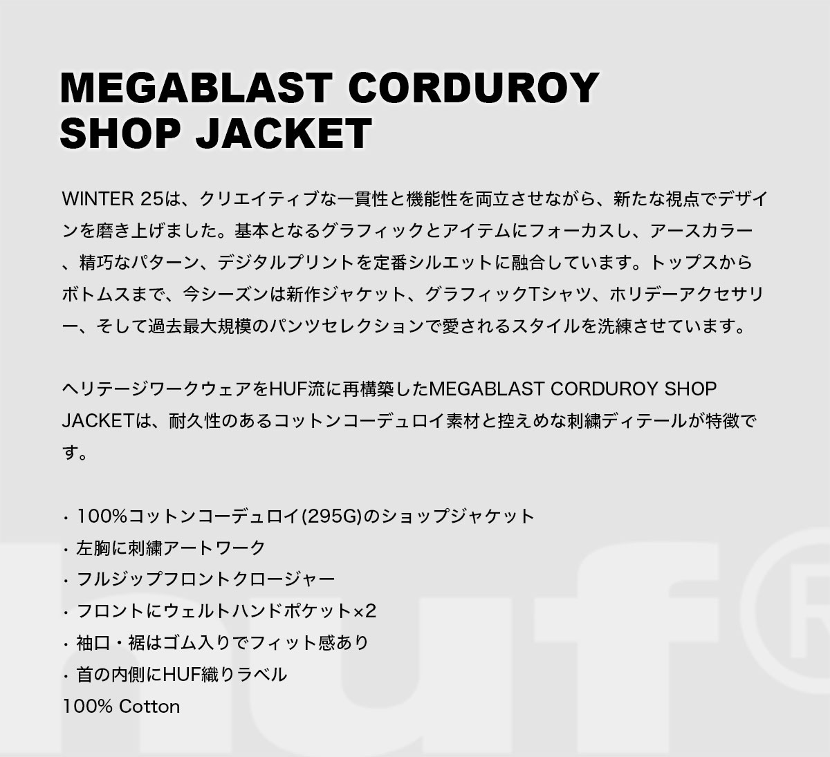 【検索キーワード】HUF ハフ ジャケット コーデュロイ メンズ レディース M L スケートボード スケーター 人気ブランド 通販 新作 2025 | MEGABLAST CORDUROY SHOP JACKET【JK00495】オススメ オシャレ シンプル カジュアル かっこいい 定番 アウトドア マリンスポーツ プレゼント 静岡県 静波 ジャックオーシャンスポーツ サーフボード スケートボード スノー アパレル patagonia他 各種ブランド 正規取扱店
