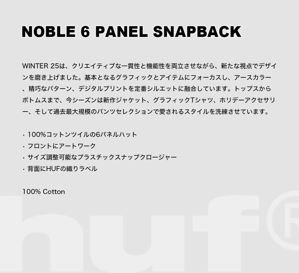 【検索キーワード】HUF ハフ メンズ キャップ 帽子 6パネル ロゴ サイズ調整可 スケートボード スケーター 人気ブランド 通販 新作 2025 | NOBLE 6 PANEL SNAPBACK【HT00905】オススメ オシャレ シンプル カジュアル かっこいい 定番 アウトドア マリンスポーツ プレゼント 静岡県 静波 ジャックオーシャンスポーツ サーフボード スケートボード スノー アパレル patagonia他 各種ブランド 正規取扱店