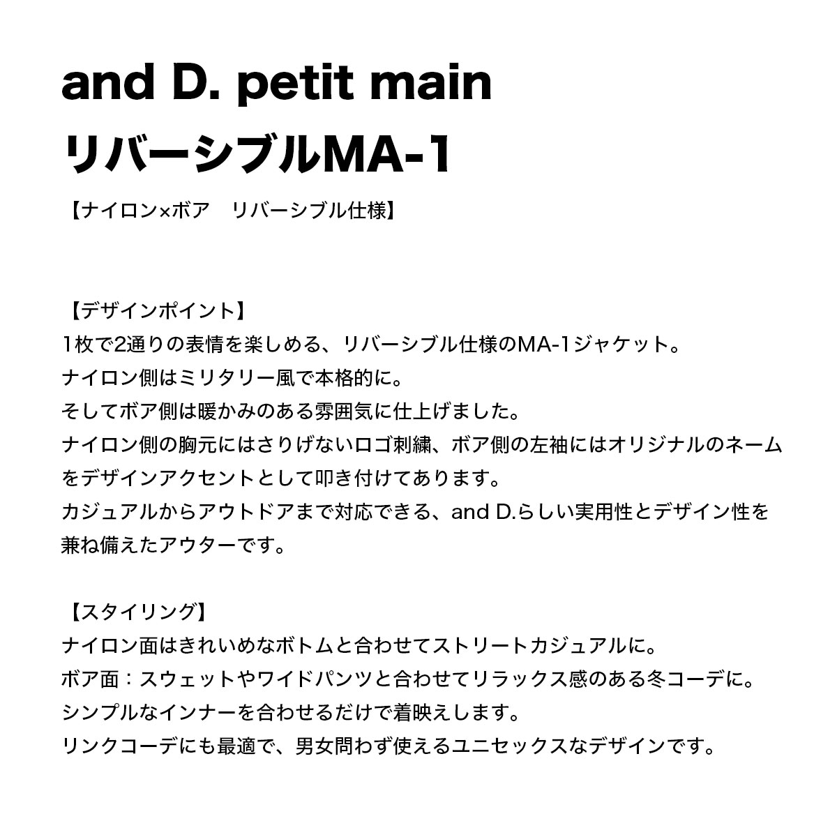 カジュアルからアウトドアまで対応できる、and D.らしい実用性とデザイン性を兼ね備えたアウターです。