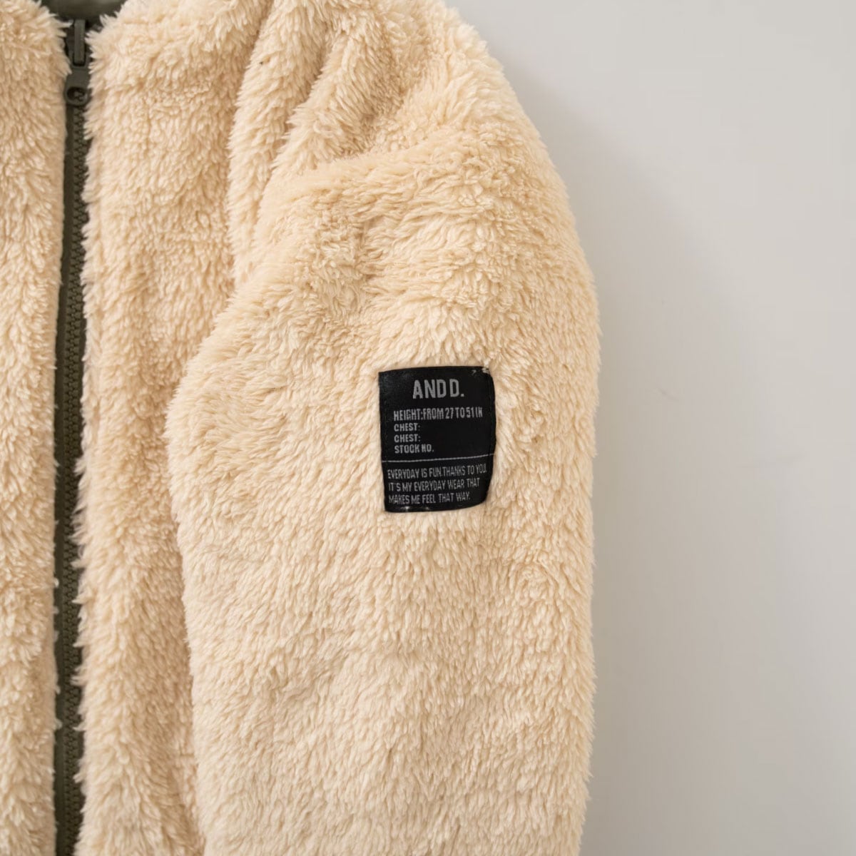 そしてボア側は暖かみのある雰囲気に仕上げました。 ナイロン側の胸元にはさりげないロゴ刺繍、ボア側の左袖にはオリジナルのネームをデザインアクセントとして叩き付けてあります。