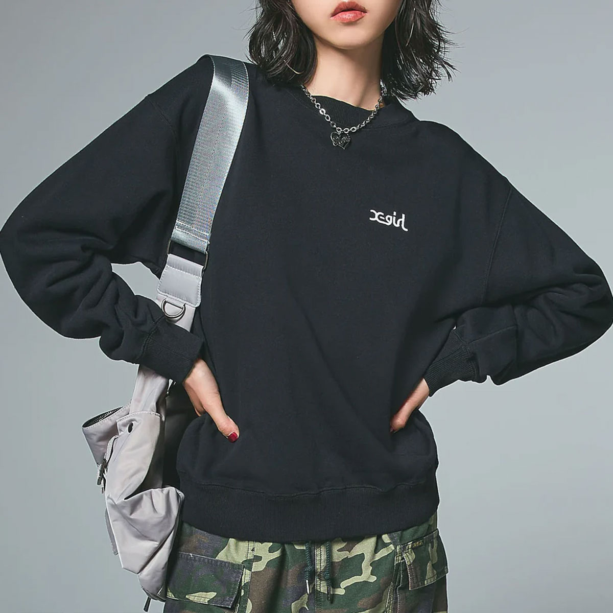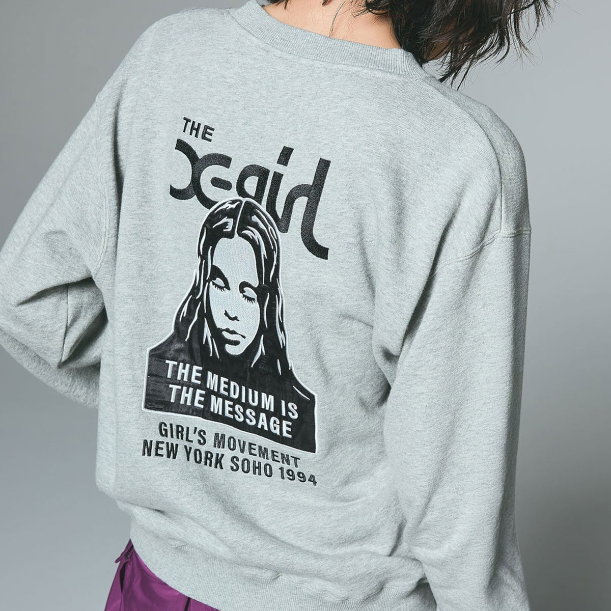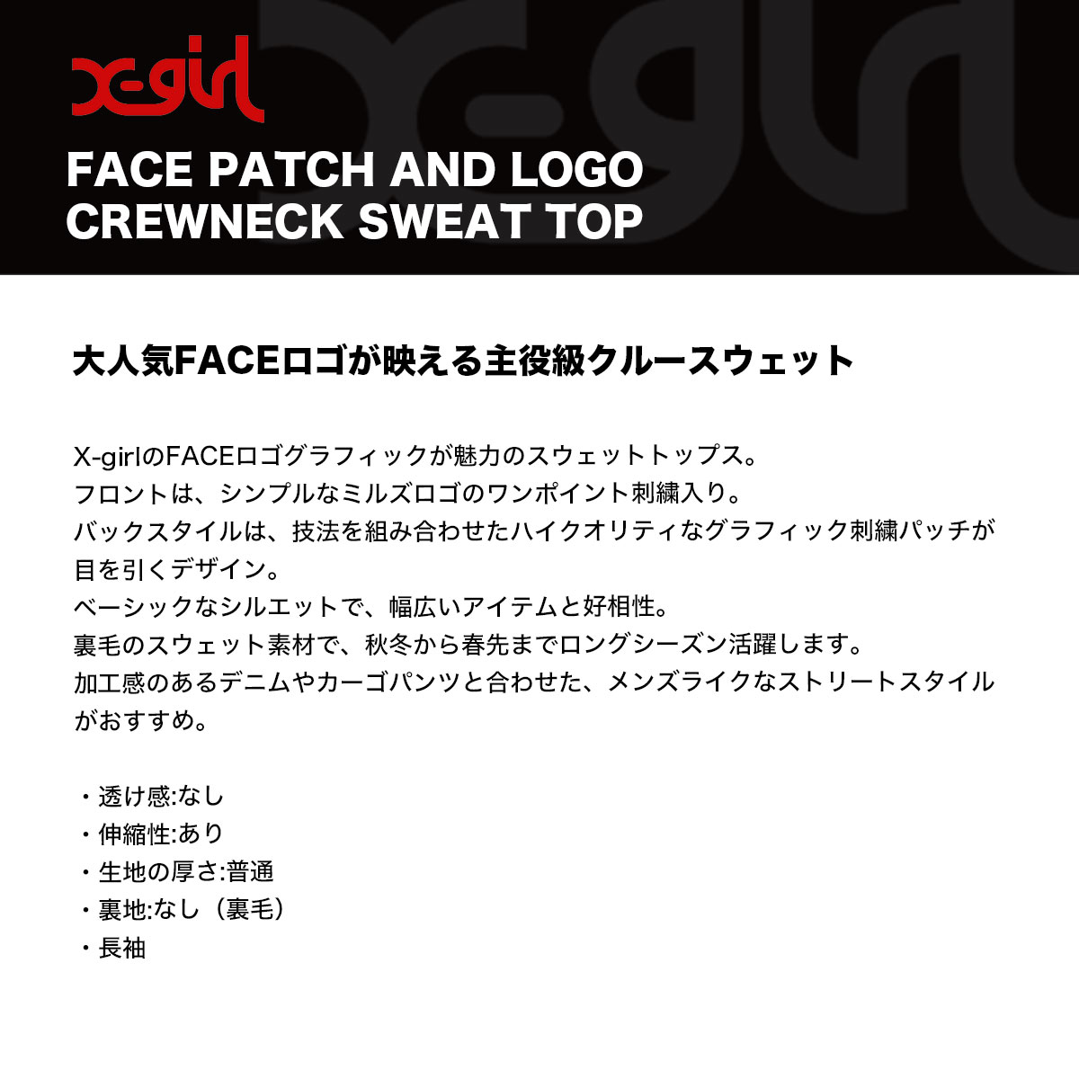 X-girlのFACEロゴグラフィックが魅力のスウェットトップス。