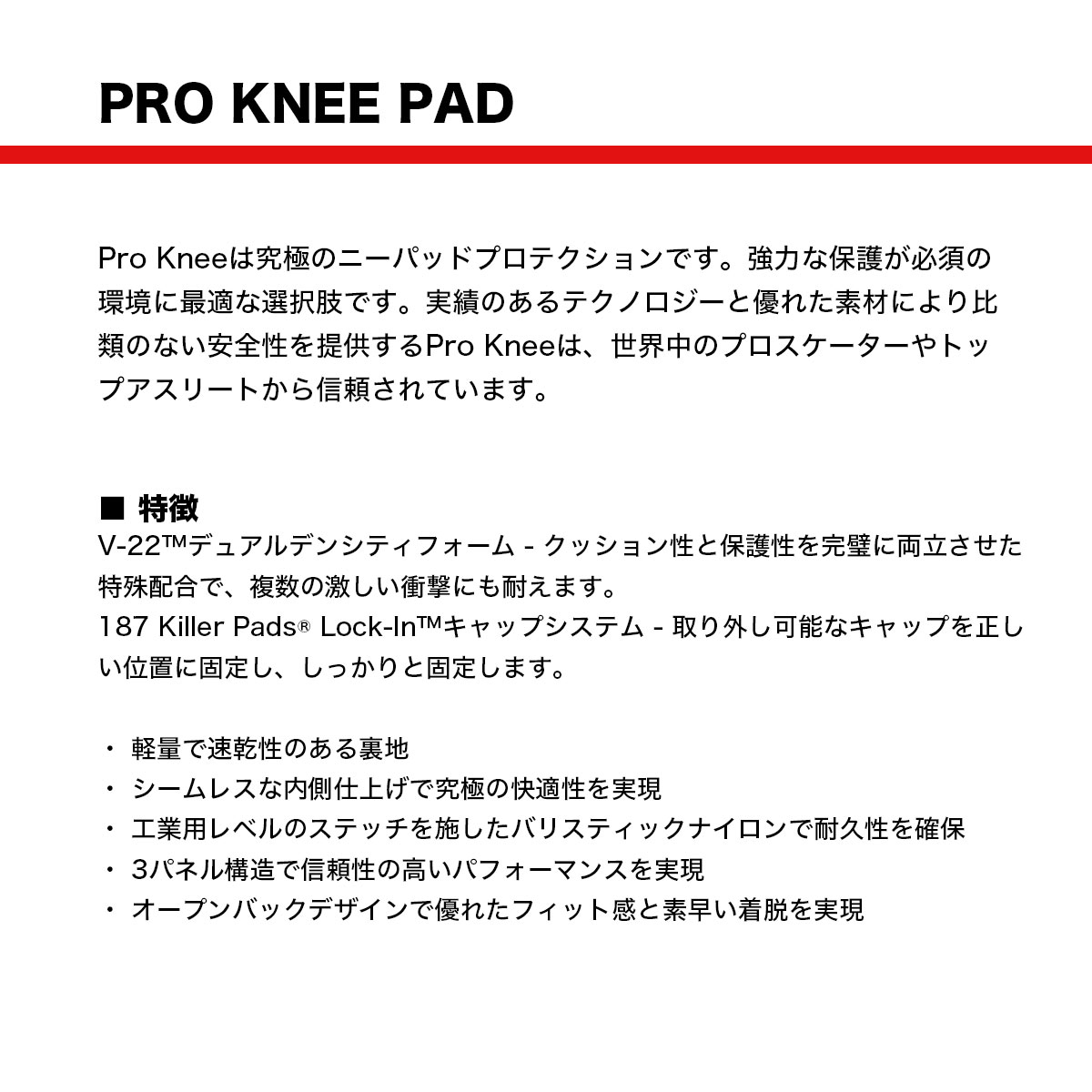 Pro Kneeは究極のニーパッドプロテクションです。強力な保護が必須の環境に最適な選択肢です。実績のあるテクノロジーと優れた素材により比類のない安全性を提供するPro Kneeは、世界中のプロスケーターやトップアスリートから信頼されています。