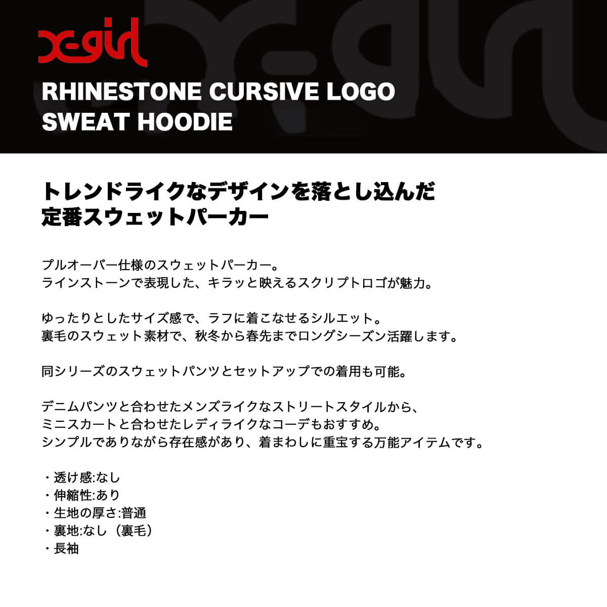 【30%OFF クリアランスセール】エックスガール レディース パーカー xgirl ラインストーン ロゴ プルオーバーパーカー トップス ストリート人気ブランド X-girl | RHINESTONE CURSIVE LOGO SWEAT HOODIE【105254012008】