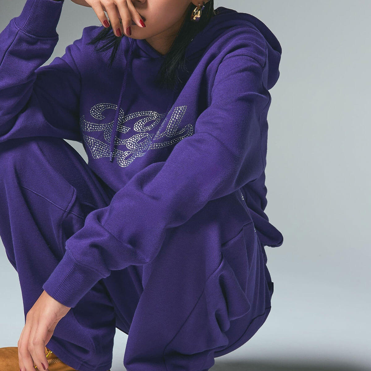 ラインストーンで表現した、キラッと映えるスクリプトロゴが魅力。