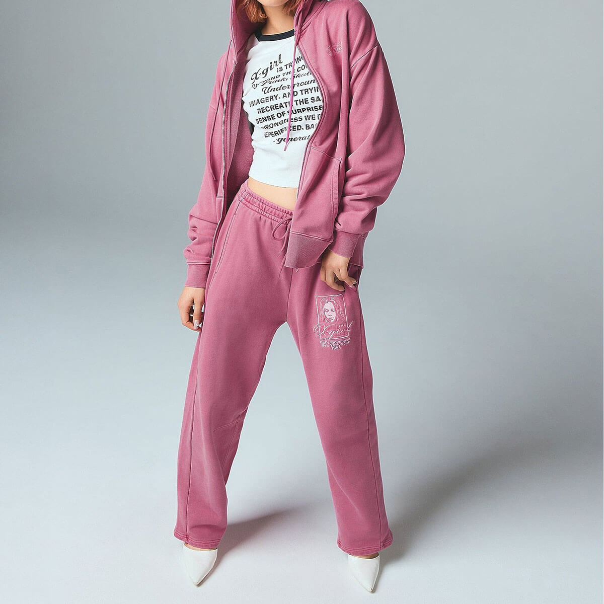 エックスガール レディース ジップパーカー xgirl faceロゴ ミルズ 羽織 トップス ピンク ストリート人気ブランド X-girl 2026 新作 | MILLS LOGO LAYERED PATCH SWEAT HOODIE【105261012014】