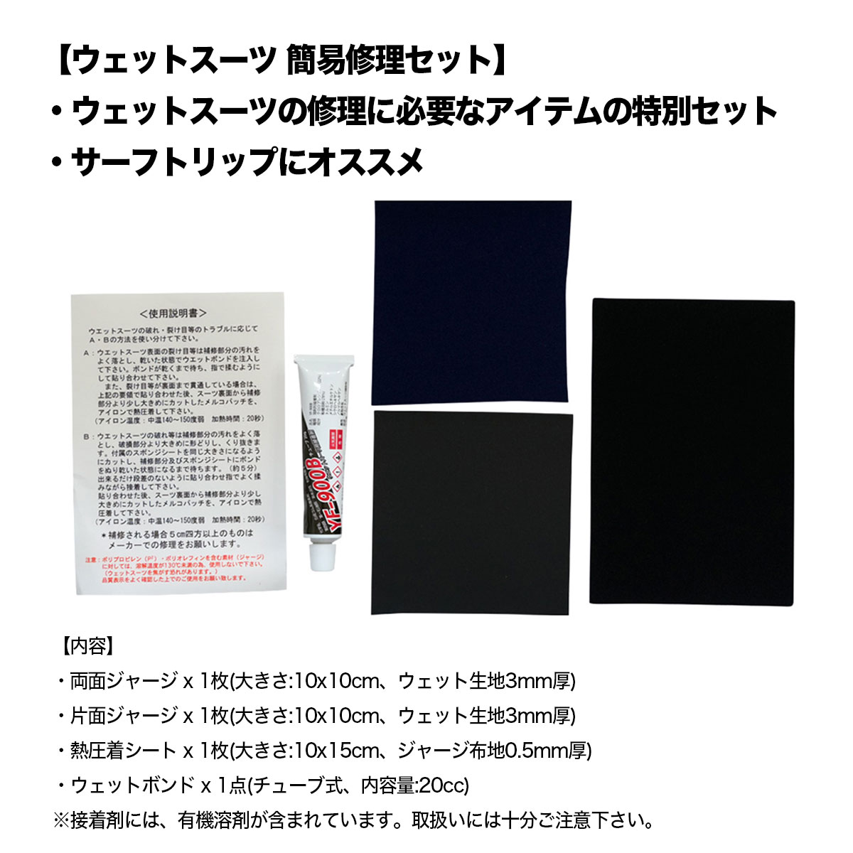 【国内正規取扱店】 PCA WETSUITS REPAIR KIT ウェットリペアキット 【666068】 【ウェットスーツ 簡易修理セット】 ・ウェットスーツの修理に必要なアイテムの特別セット ・サーフトリップにオススメ ・両面ジャージ x 1枚(大きさ:10x10cm、ウェット生地3mm厚) ・片面ジャージ x 1枚(大きさ:10x10cm、ウェット生地3mm厚) ・熱圧着シート x 1枚(大きさ:10x15cm、ジャージ布地0.5mm厚) ・ウェットボンド x 1点(チューブ式、内容量:20cc) ※接着剤には、有機溶剤が含まれています。取扱いには十分ご注意下さい。