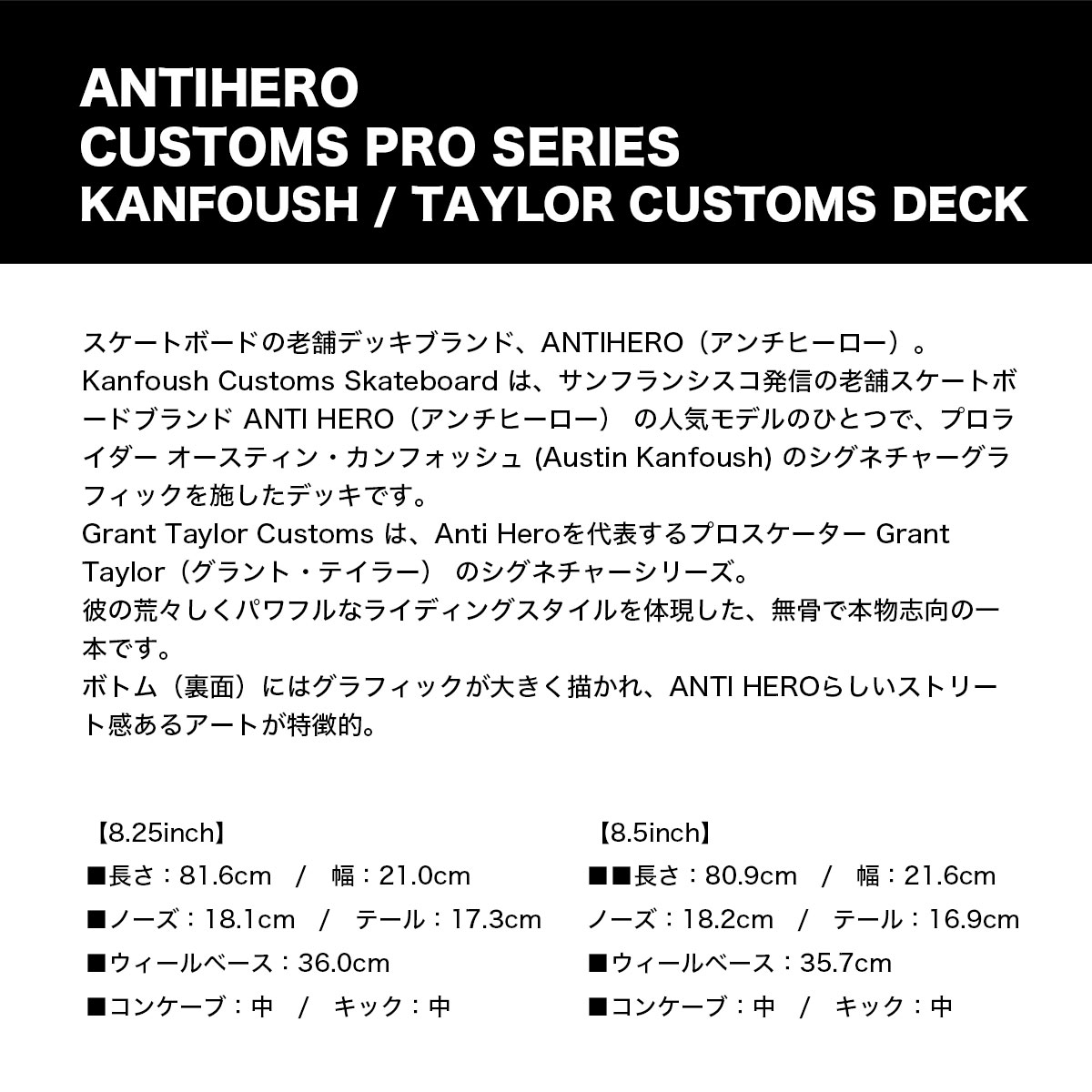 【国内正規取扱店】 ANTI HERO/アンチヒーロー CUSTOMS PRO SERIES KANFOUSH / TAYLOR CUSTOMS DECK スケートボード デッキ スケートボードの老舗デッキブランド、ANTIHERO(アンチヒーロー)。 Kanfoush Customs Skateboard は、サンフランシスコ発信の老舗スケートボードブランド ANTI HERO(アンチヒーロー) の人気モデルのひとつで、プロライダー オースティン・カンフォッシュ (Austin Kanfoush) のシグネチャーグラフィックを施したデッキです。 Grant Taylor Customs は、Anti Heroを代表するプロスケーター Grant Taylor(グラント・テイラー) のシグネチャーシリーズ。 彼の荒々しくパワフルなライディングスタイルを体現した、無骨で本物志向の一本です。 【商品詳細】 ■カラー:ブラック / イエロー ■サイズ: 【8.25inch】 ・長さ:81.6cm / 幅:21.0cm ・ノーズ:18.1cm / テール:17.3cm ・ウィールベース:36.0cm ・コンケーブ:中 / キック:中 【8.5inch】 ・長さ:80.9cm / 幅:21.6cm ・ノーズ:18.2cm / テール:16.9cm ・ウィールベース:35.7cm ・コンケーブ:中 / キック:中